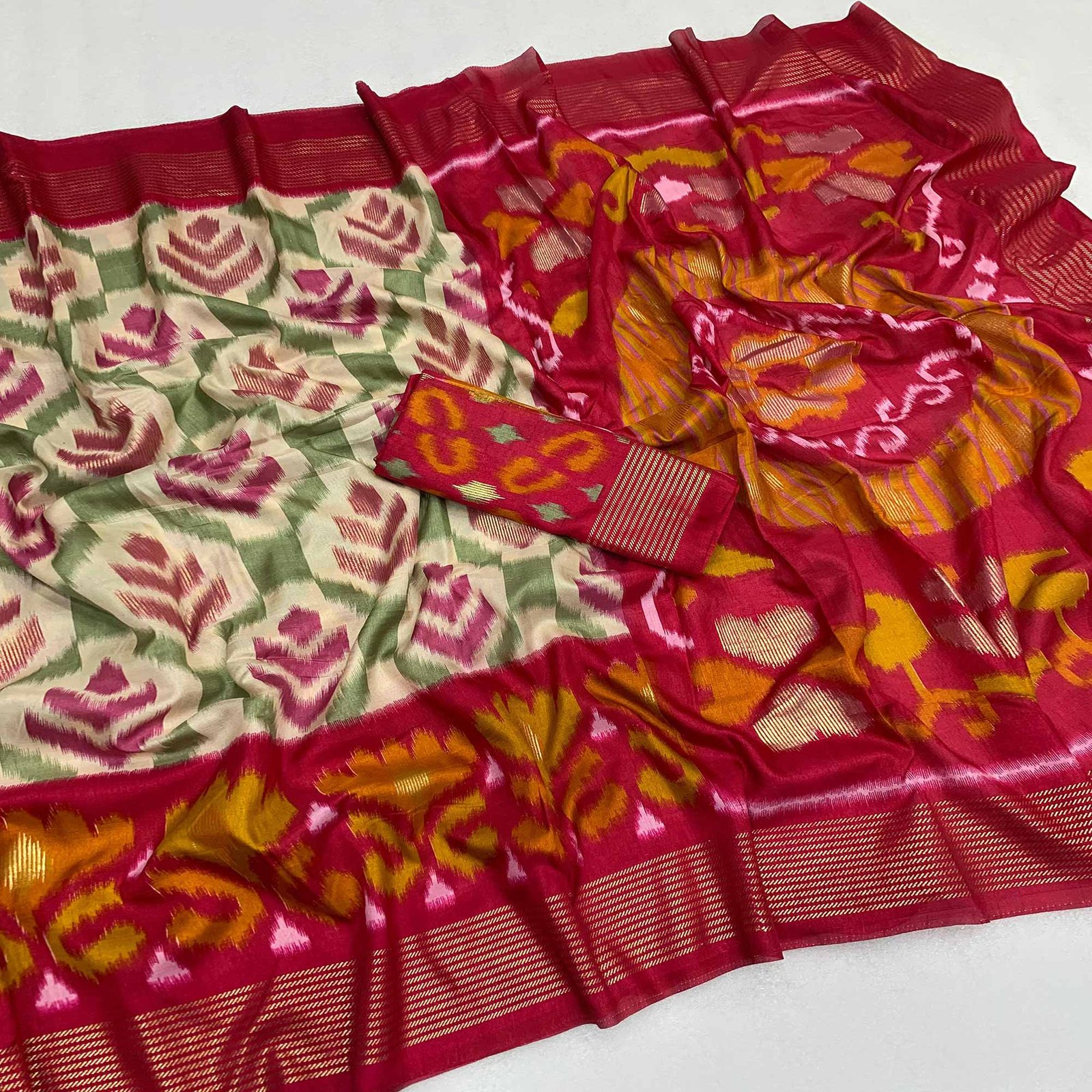 Off White & Pink Patola Printed Viscose Saree With Zari Border