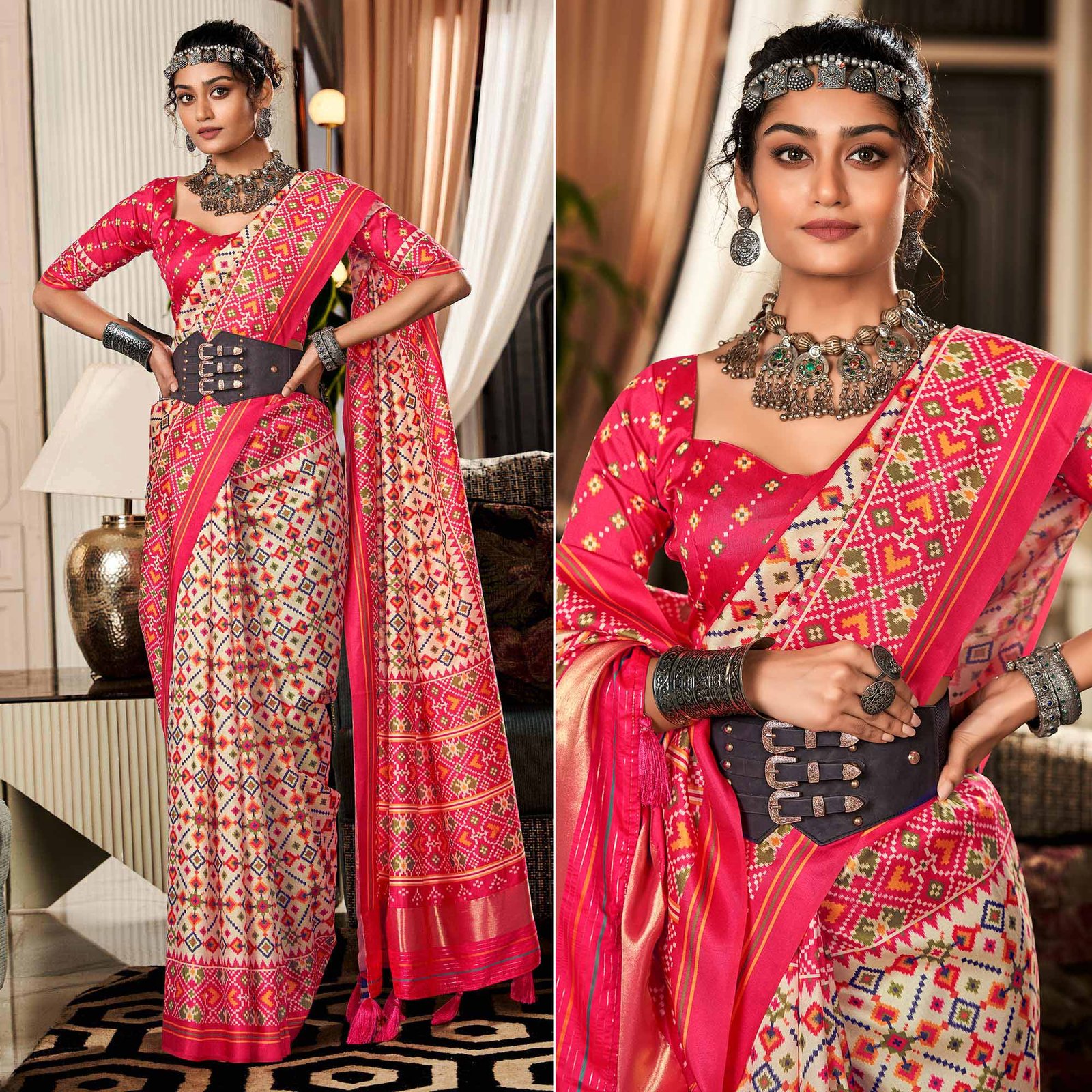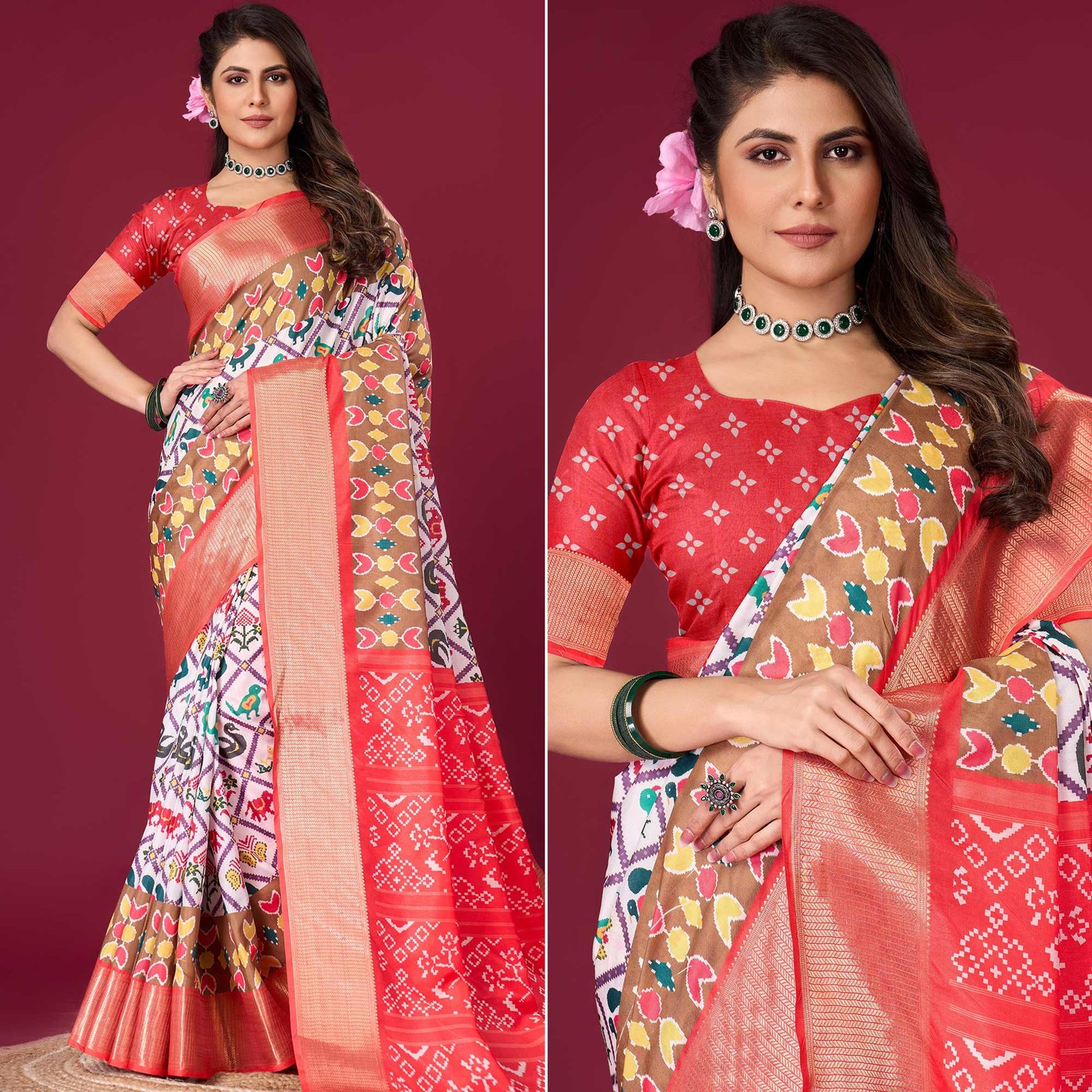 White & Red Digital Patola Printed With Woven Border Dola Silk Saree