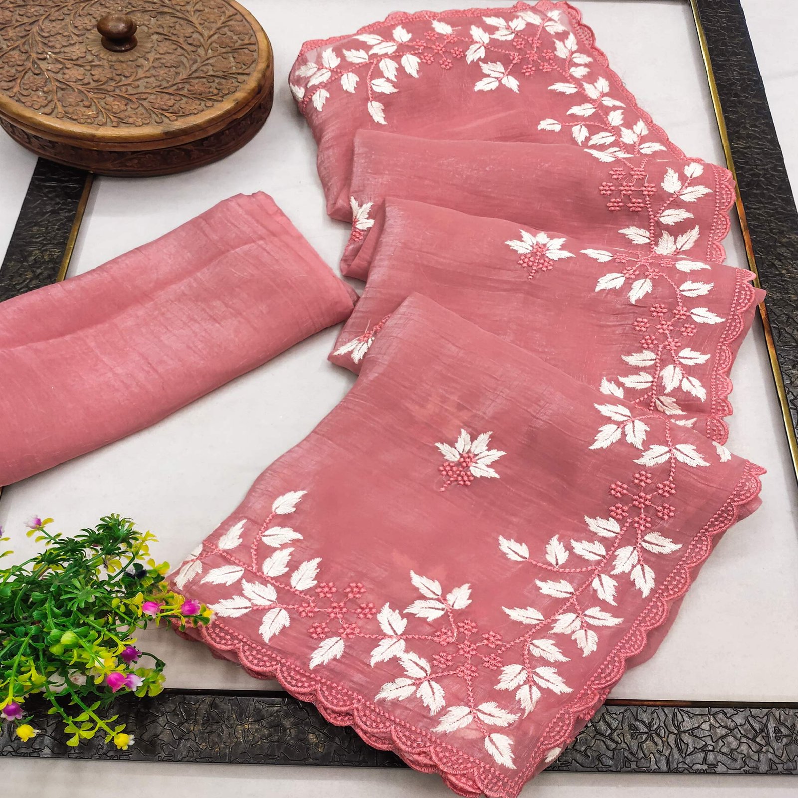 Peach Organza Saree Featuring Fine Floral Embroidery