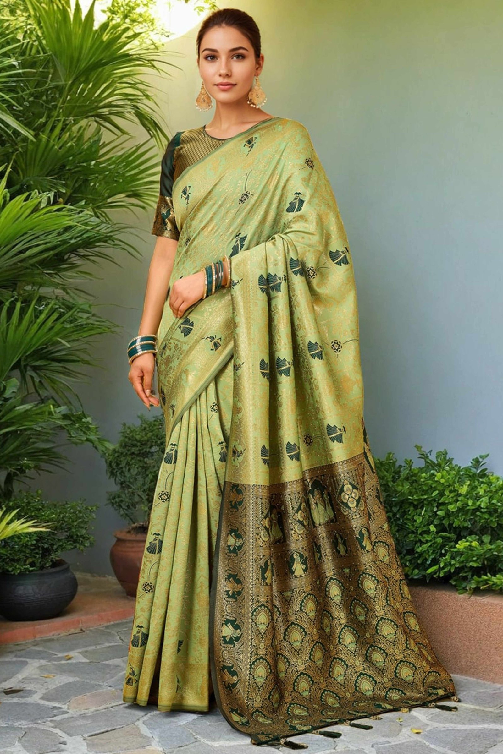 Olive Green Woven Tissue Paithani Saree With Tassels