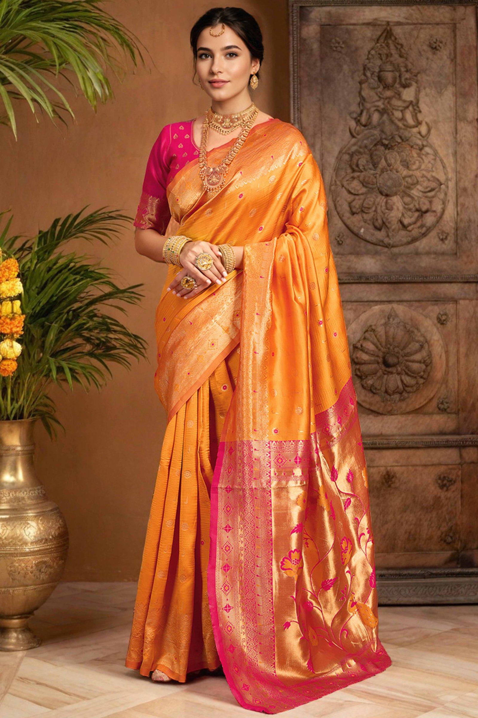 Orange Silk Blend Saree With Traditional Paithani Zari Weaving Of Peacock & Floral Designs