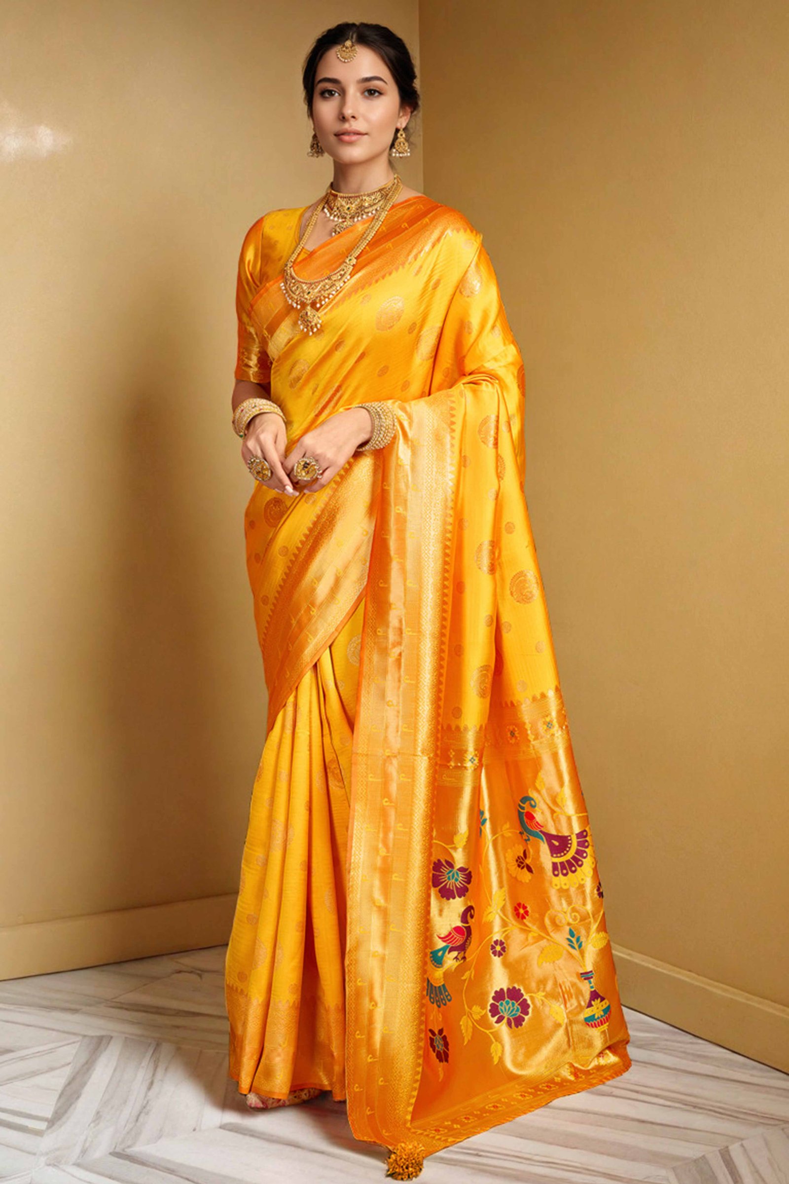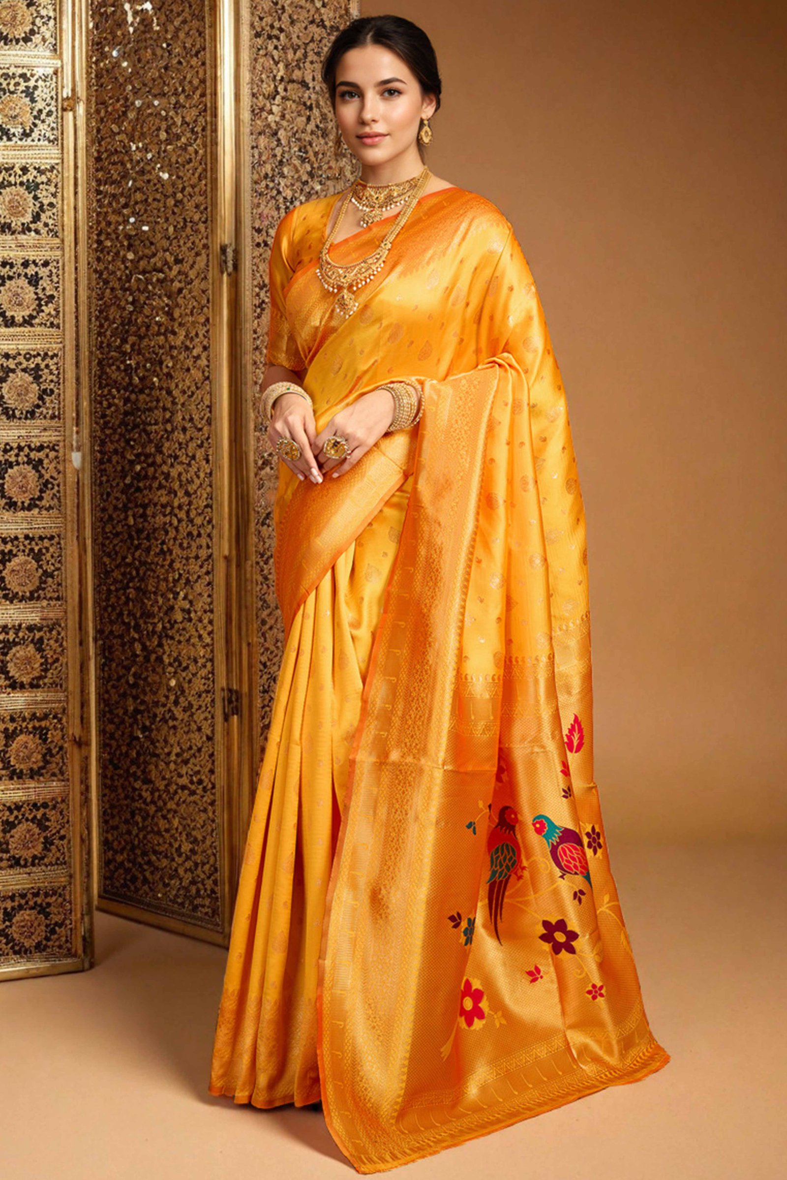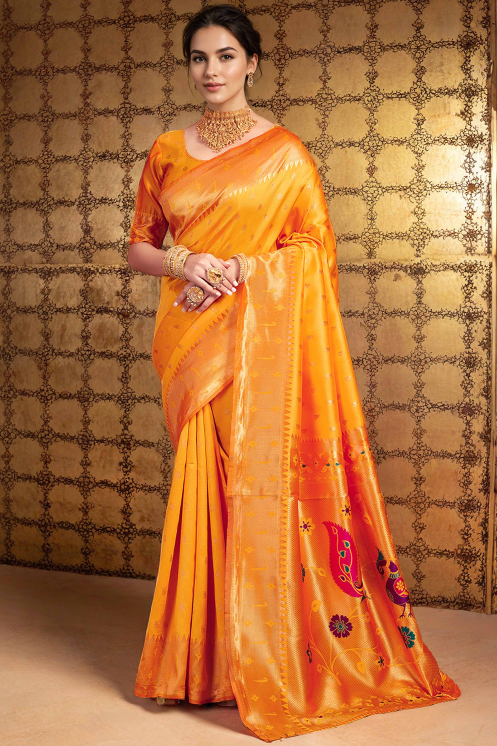 Orange Silk Blend Paithani Saree Showcasing Rich Zari Weaving With Birds & Floral Accents