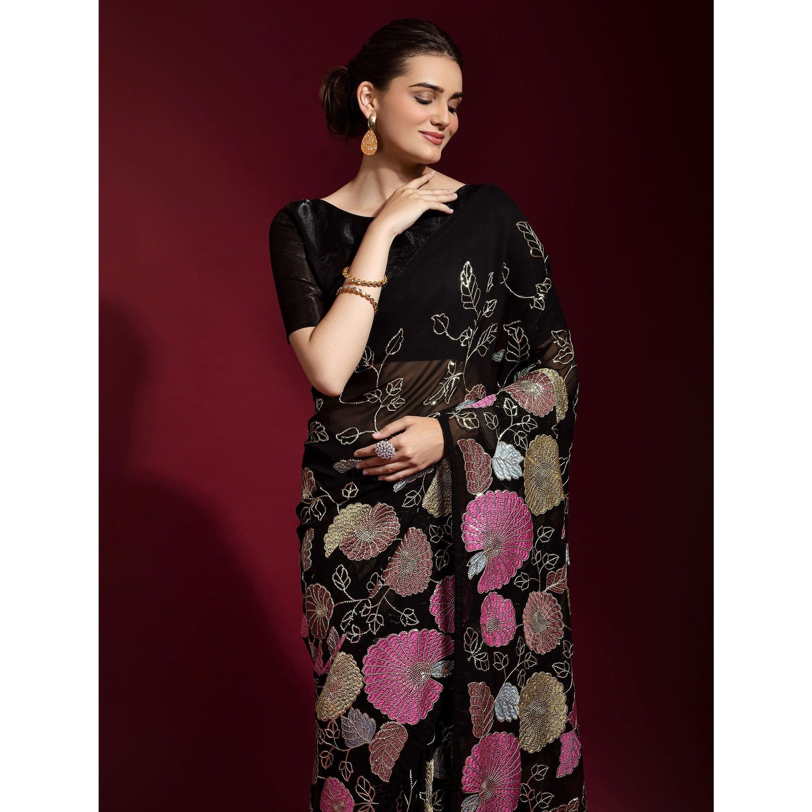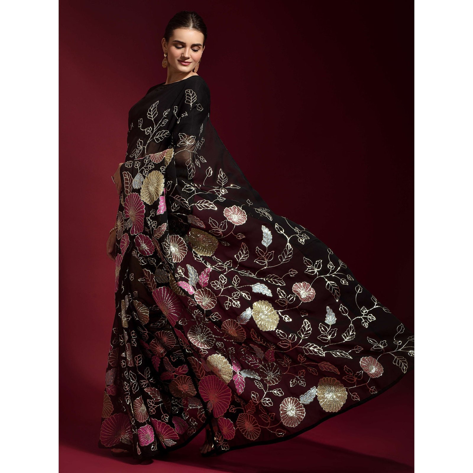 Black Floral Sequins Embroidered Georgette Saree