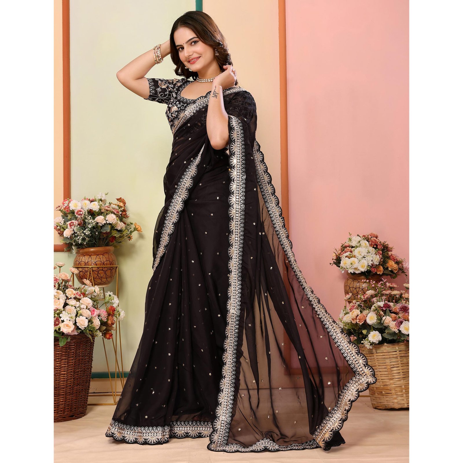 Black colored saree is made from organza fabric which is highlighted with beautiful sequins embroidered work as shown. Comes along with unstitched mono banglori blouse piece which you can customise as per your design/style. Occasion – You can wear this saree for festive and functions. Note:- the actual product may differ slightly in color and design from the one illustrated in the images when compared with computer or mobile screen.