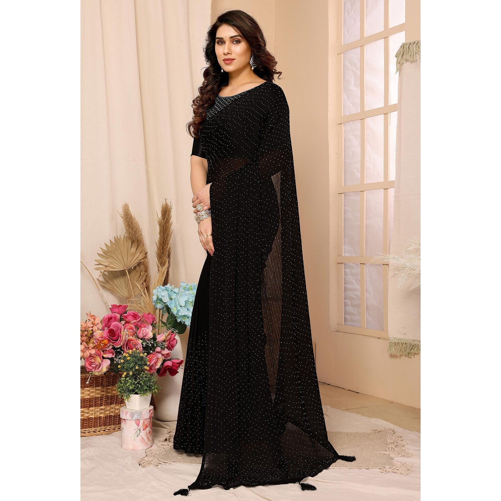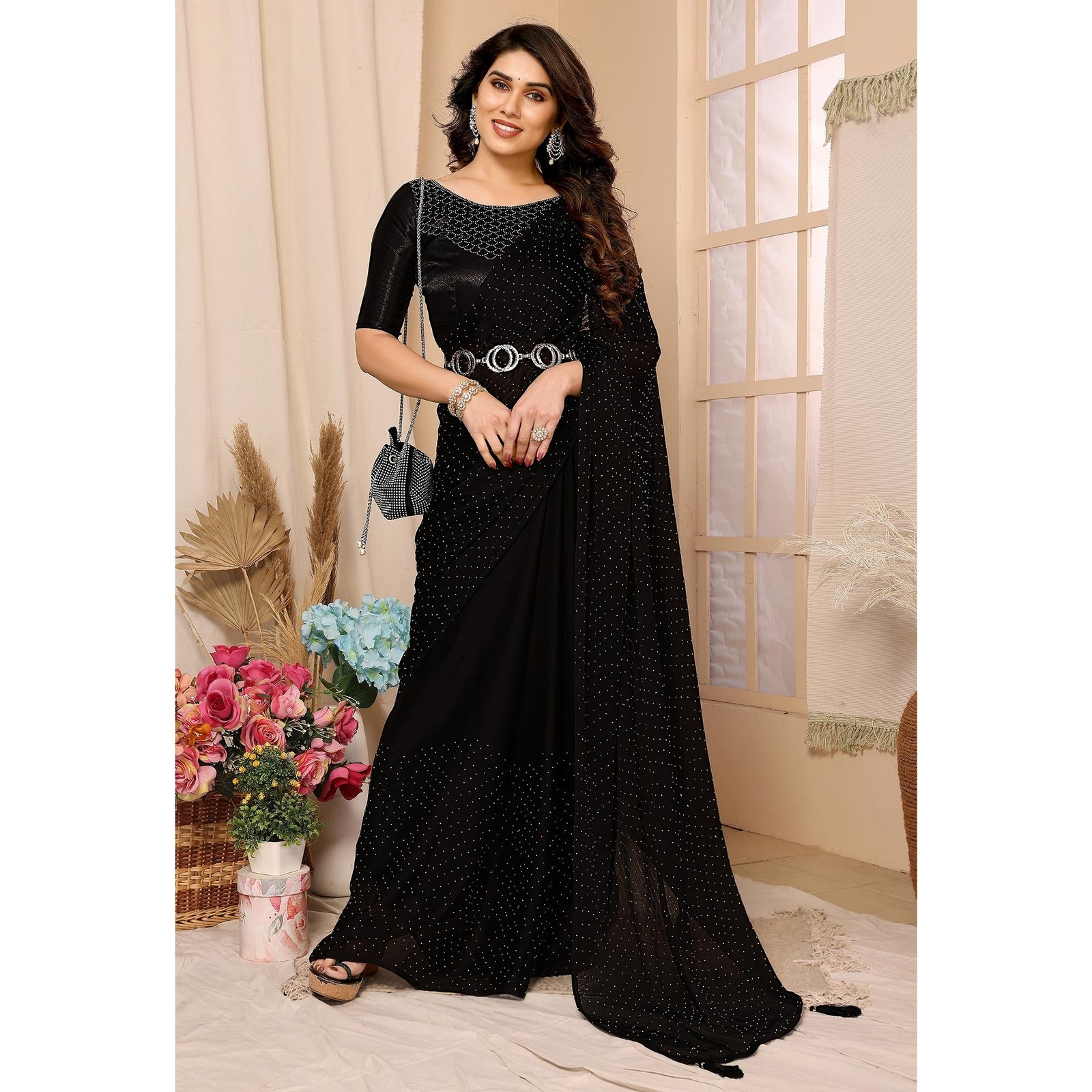Black colored saree is made from satin chiffon fabric which is highlighted with beautiful swarovski work as shown. Comes along with unstitched stone work satin blouse piece which you can customise as per your design/style. Occasion – You can wear this saree for party, functions and fashionista.