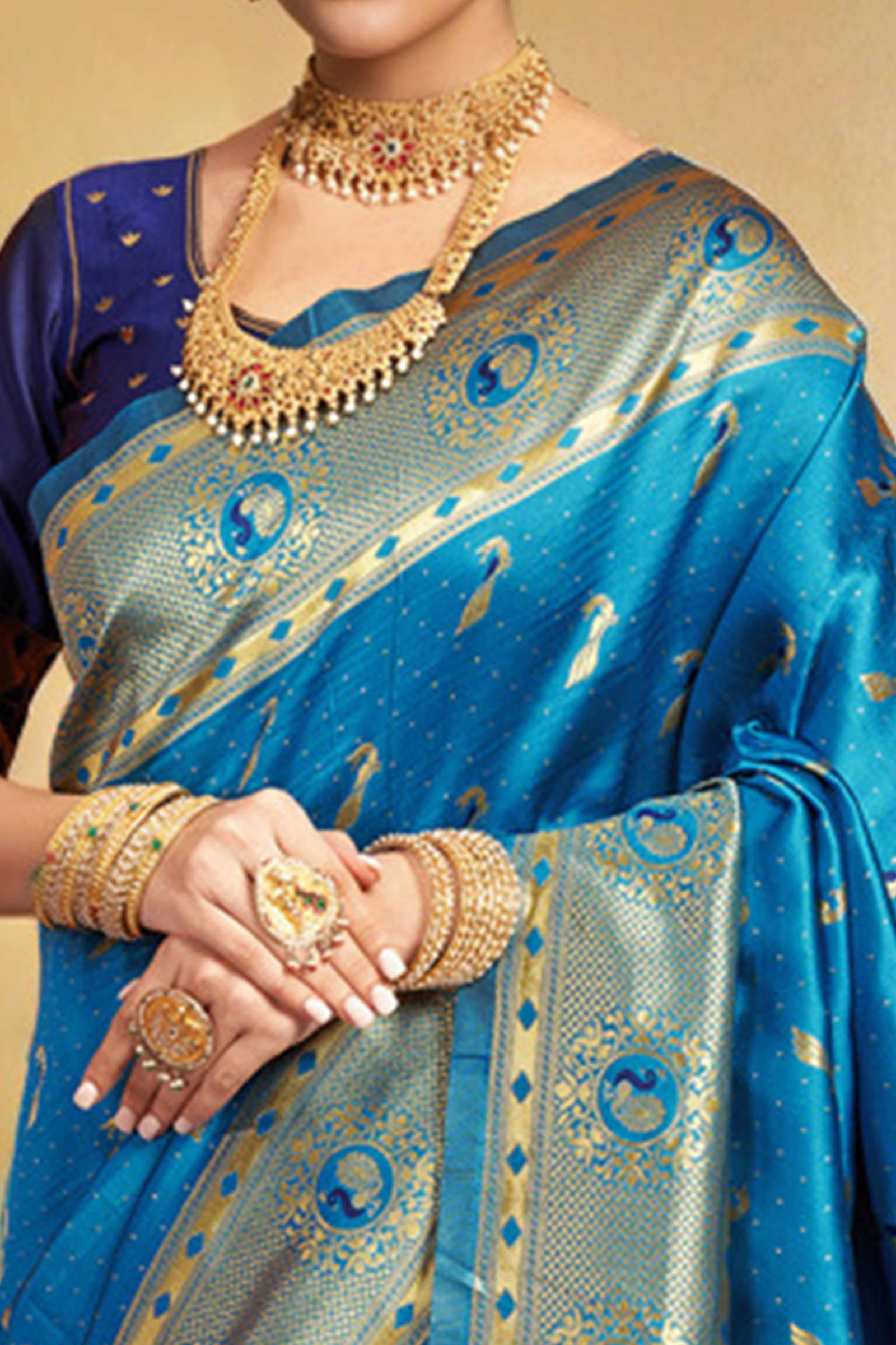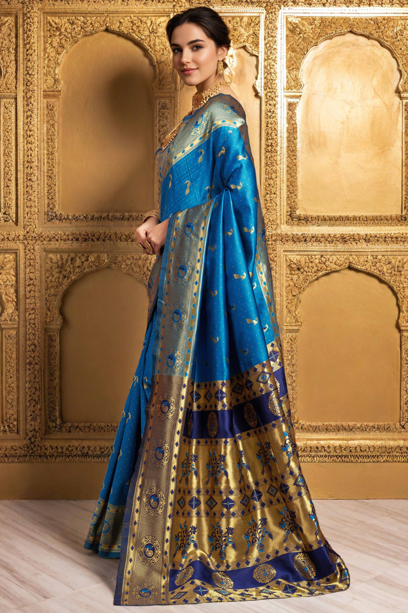 - Elegant Appeal: Step into timeless elegance with this exquisite blue Paithani saree, adorned with intricate zari weaving and a meticulously crafted peacock and floral motif pallu. A graceful blend of tradition and sophistication, it’s designed to make a lasting impression at every special occasion.