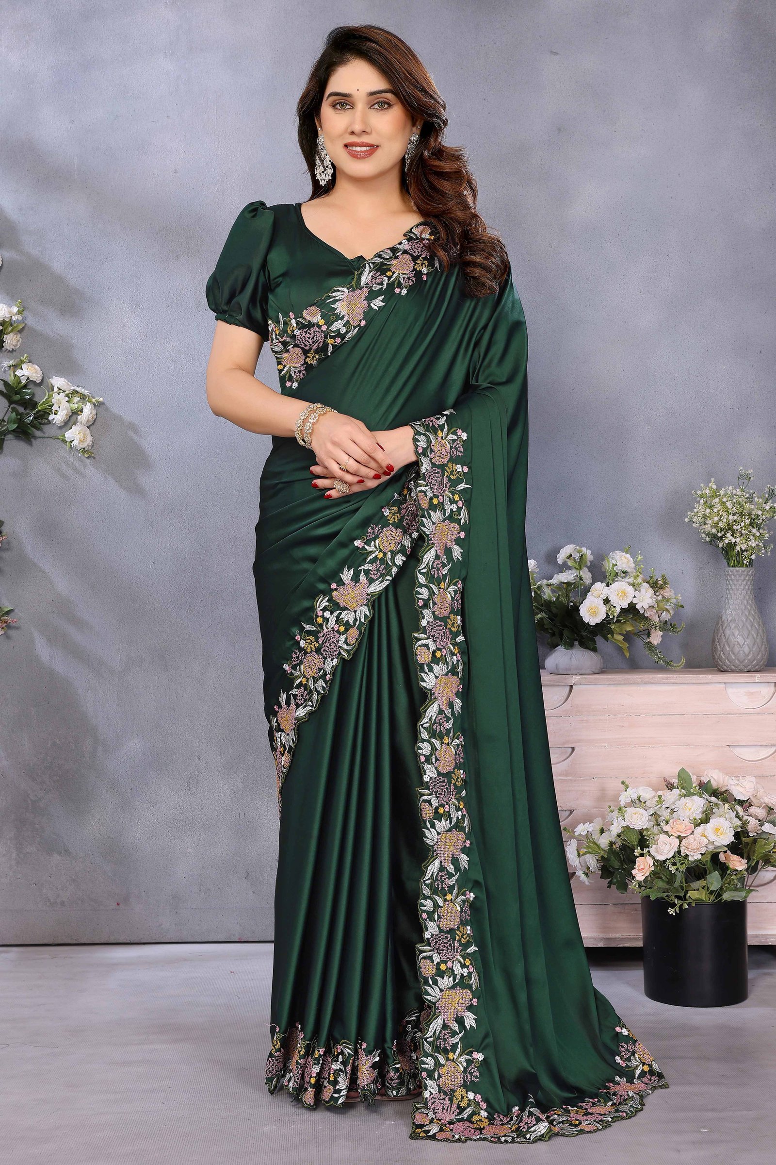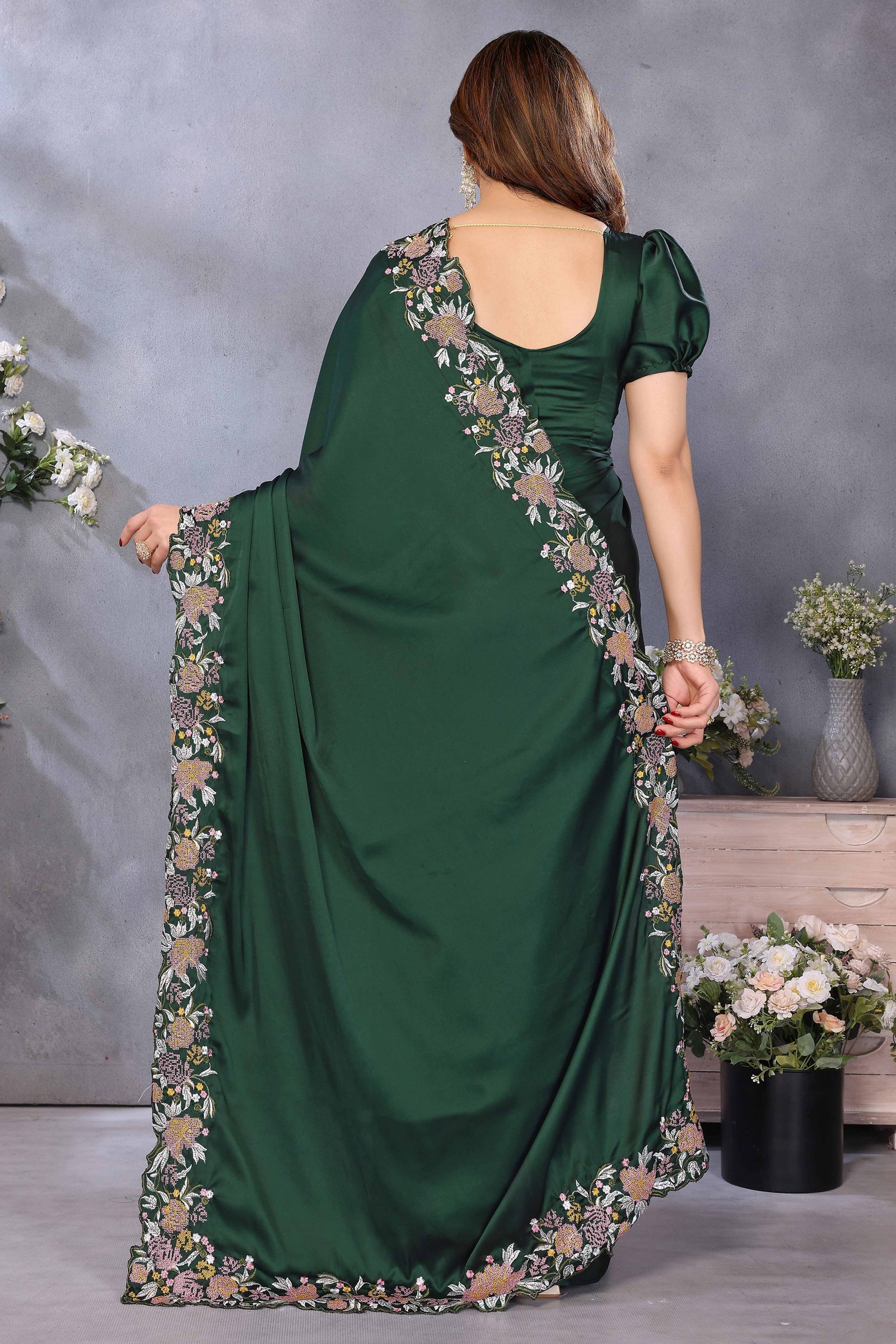 - Deep Elegance: Bottle Green colored saree adorned with beautiful embroidery work, showcasing a sophisticated and festive style as shown.