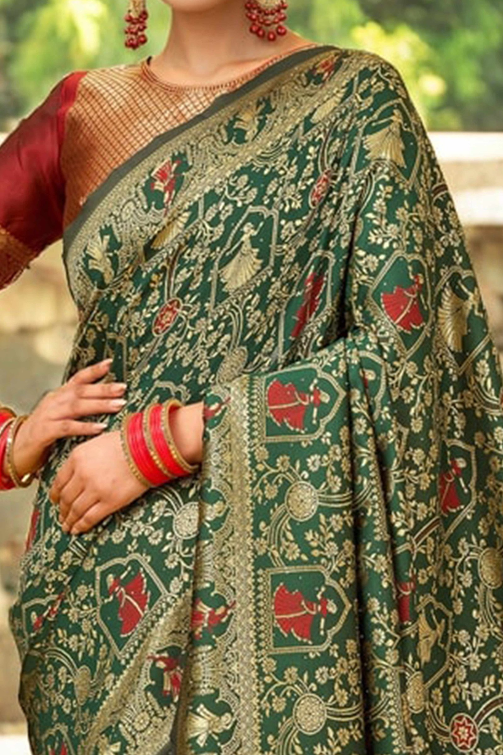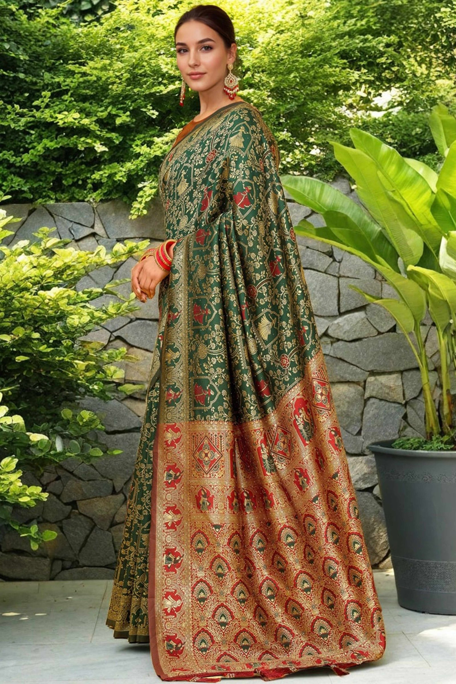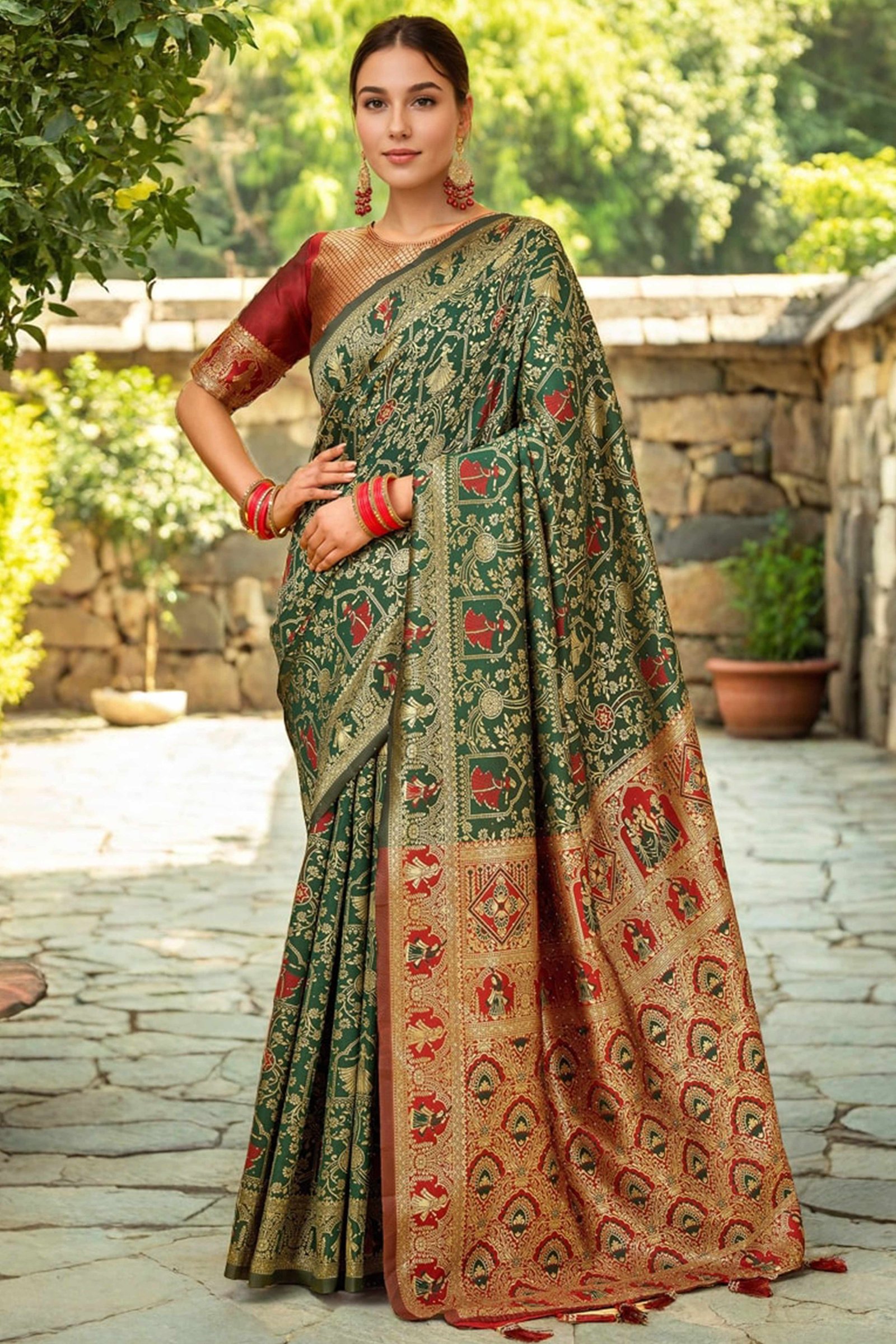 Dark Green Paithani Saree In Silk Blend Highlighted With Floral Weaving & Tasselled Edge