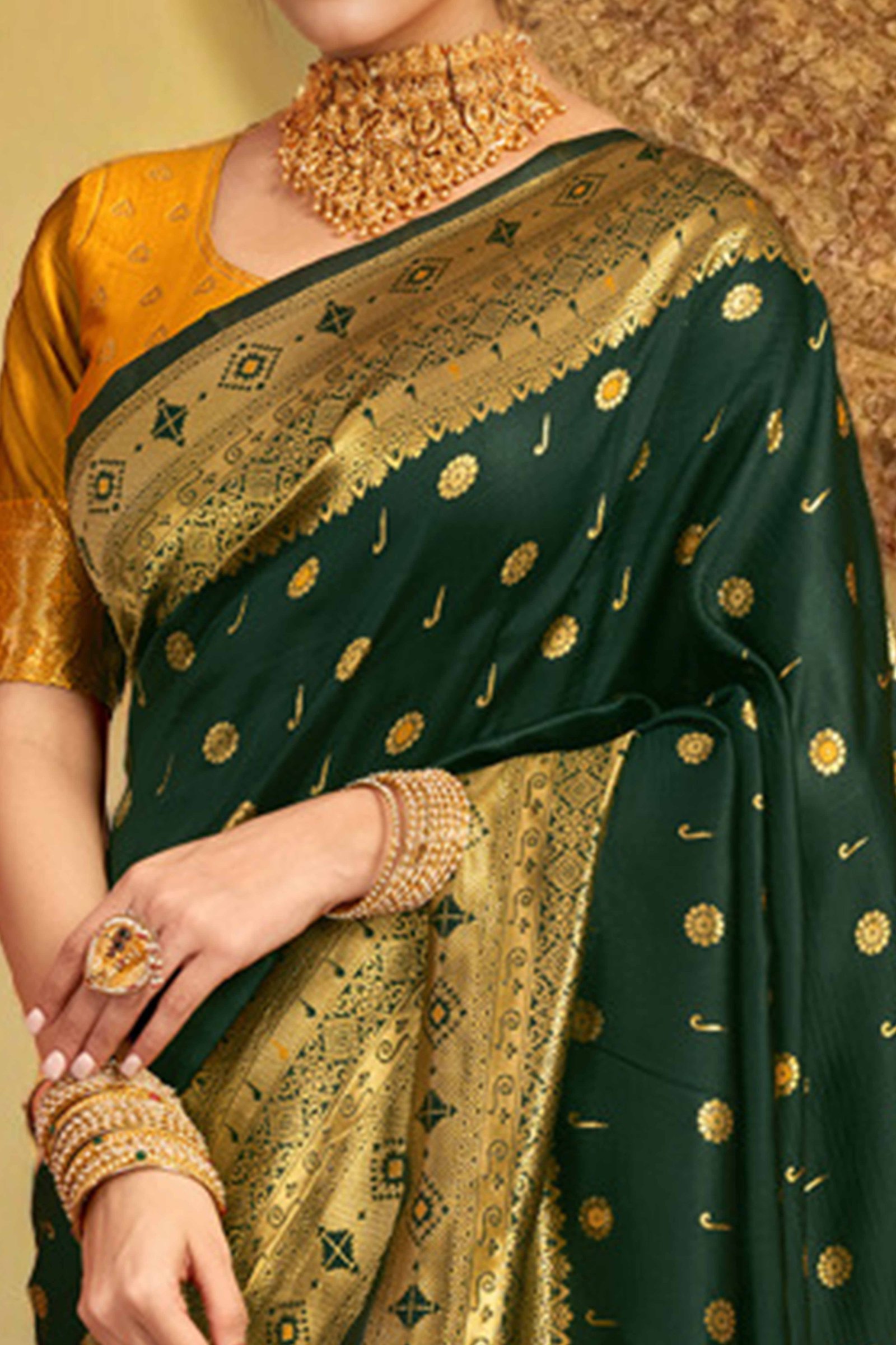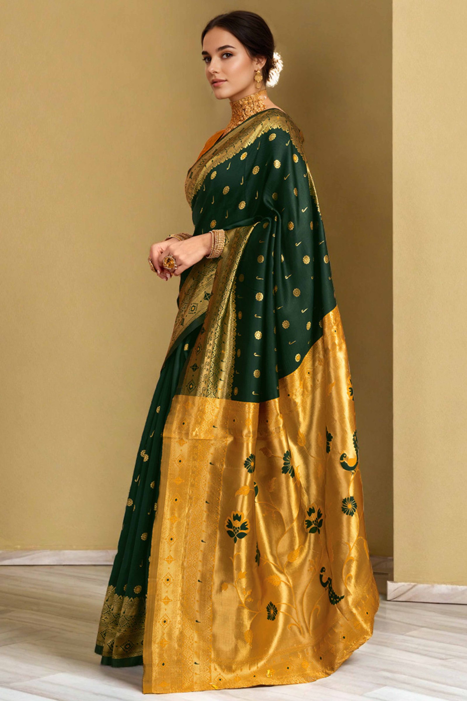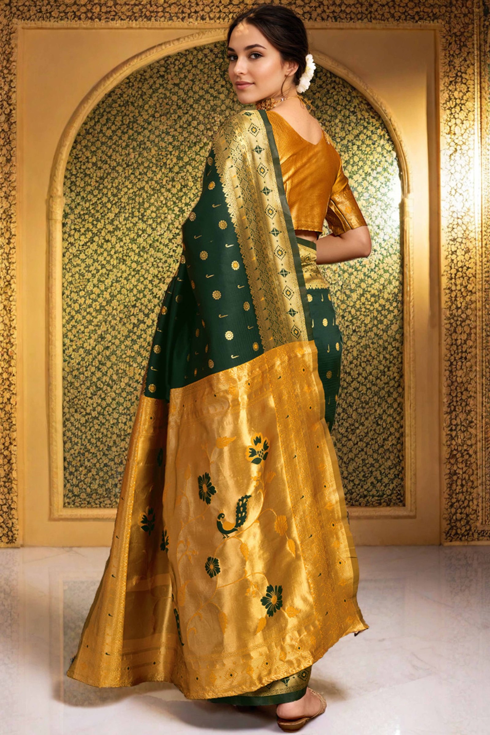 Dark Green Silk Blend Saree With Traditional Paithani Zari Weaving Of Peacock & Floral Designs