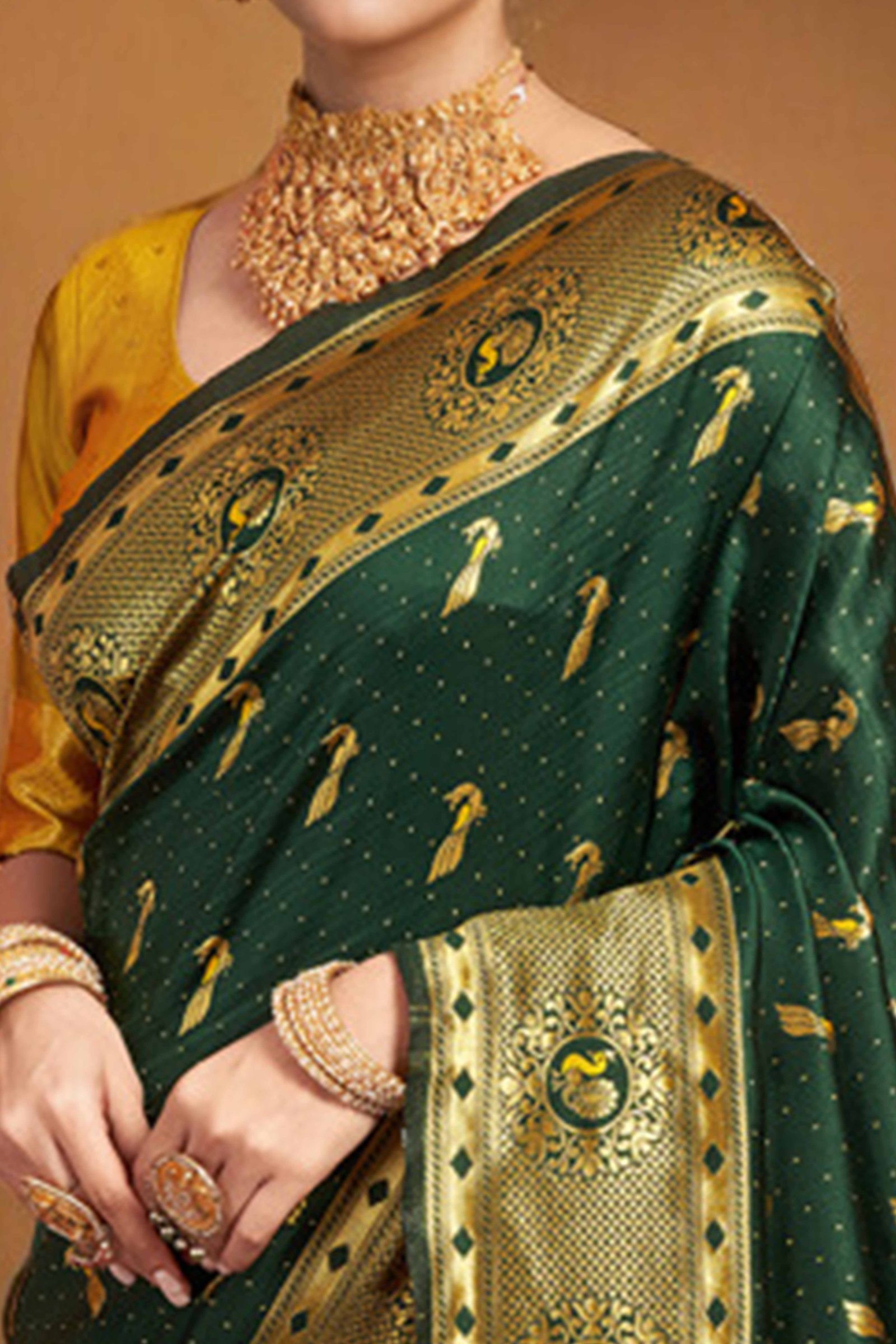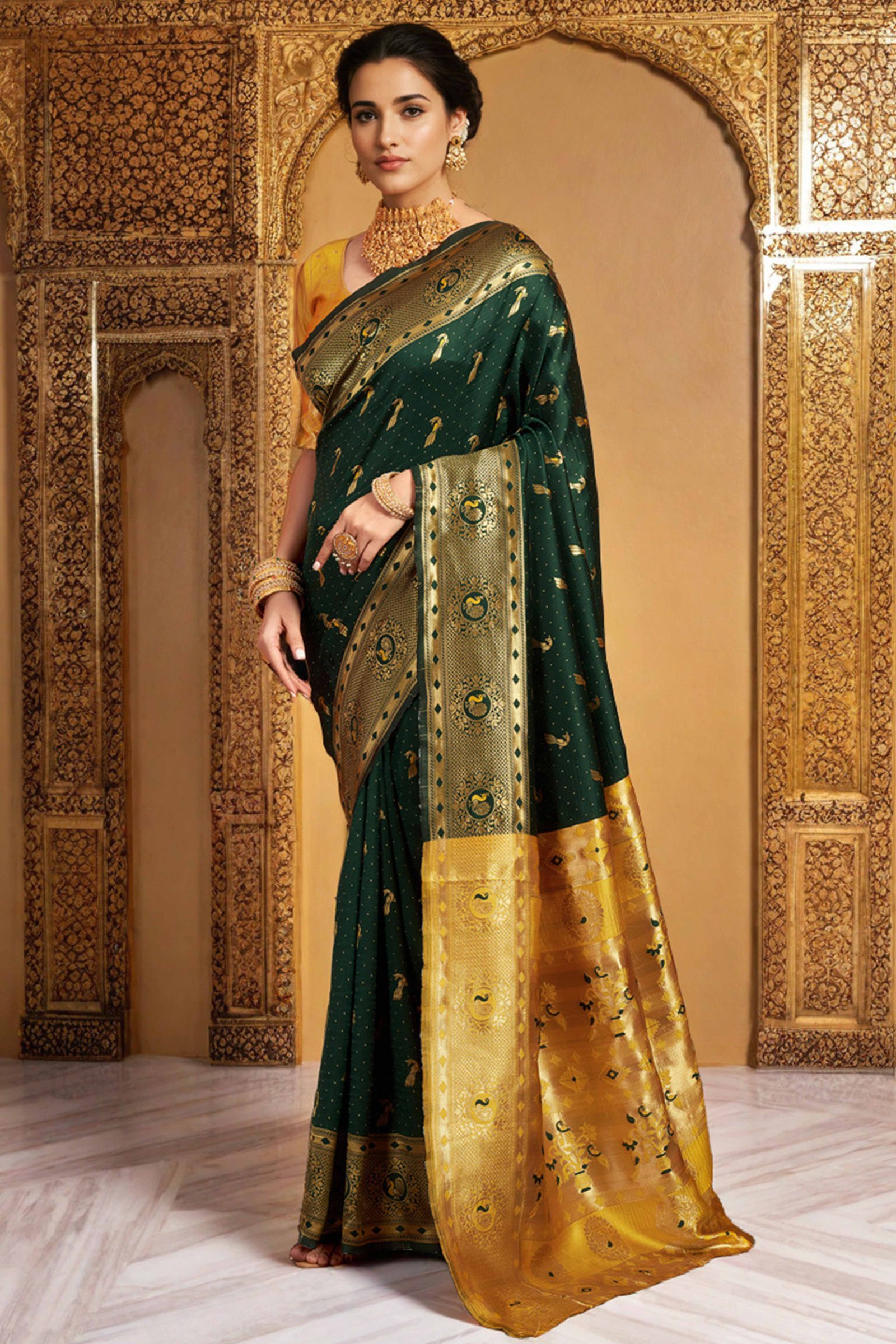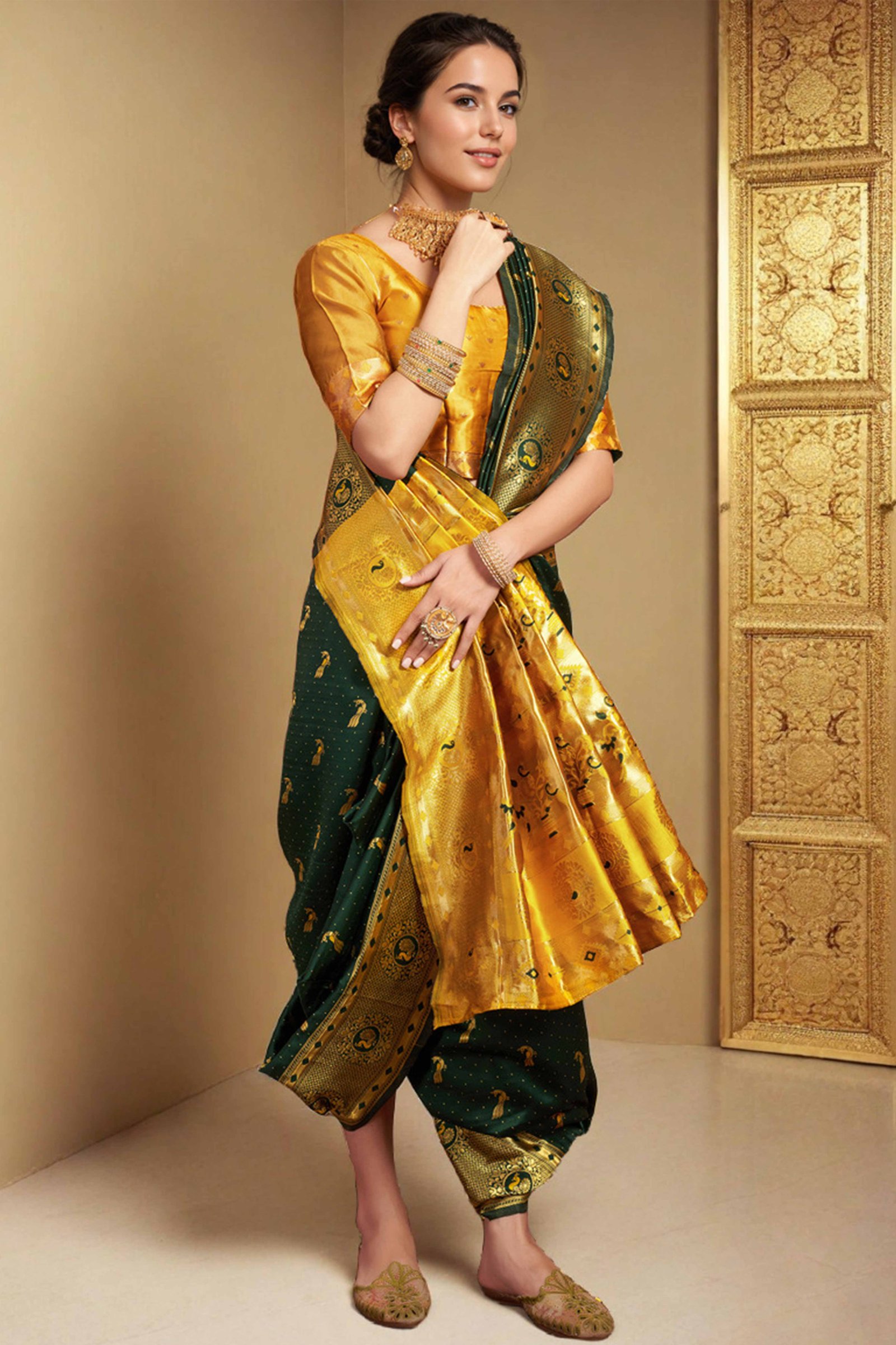 - Elegant Appeal: Step into timeless elegance with this exquisite green Paithani saree, adorned with intricate zari weaving and a meticulously crafted peacock and floral motif pallu. A graceful blend of tradition and sophistication, it’s designed to make a lasting impression at every special occasion.