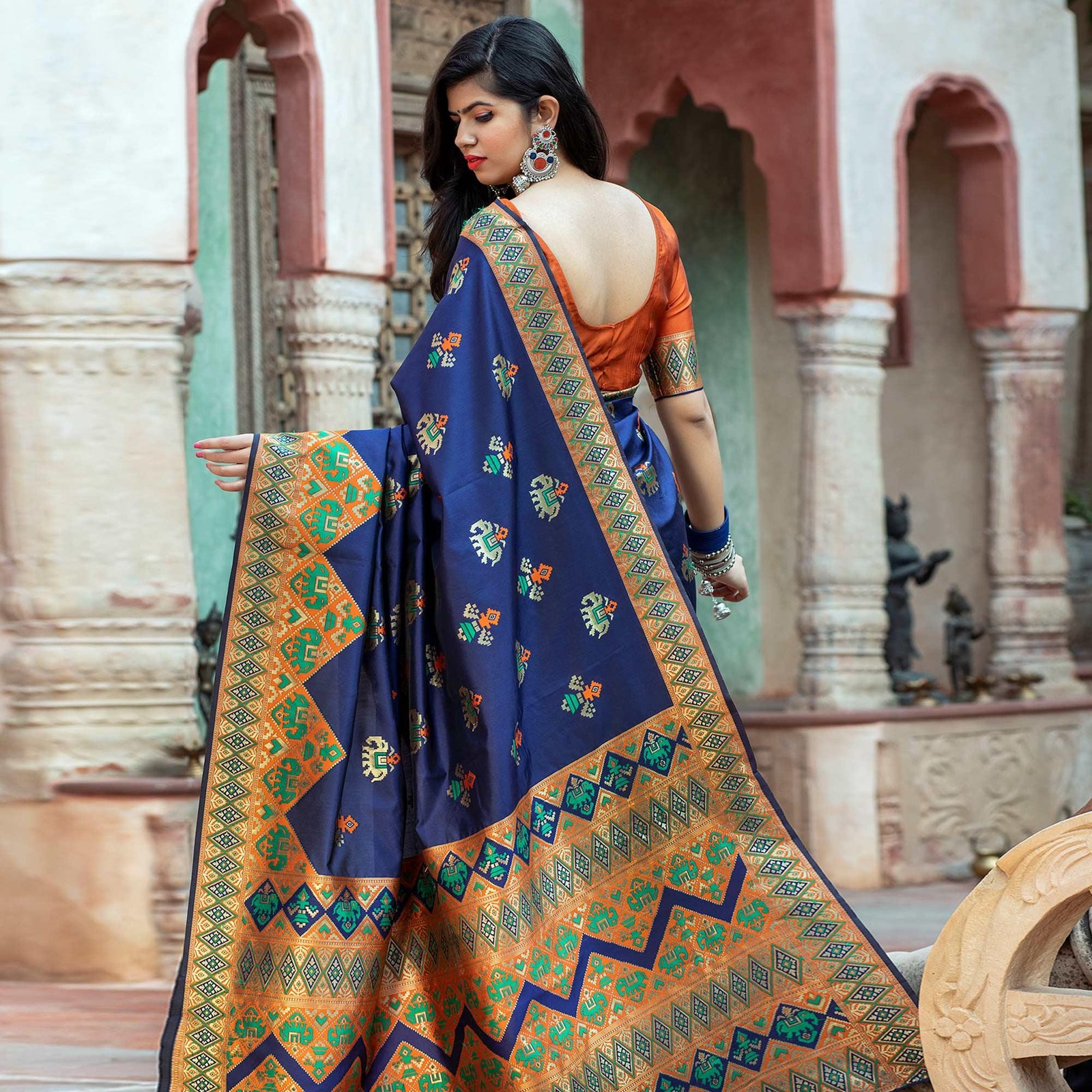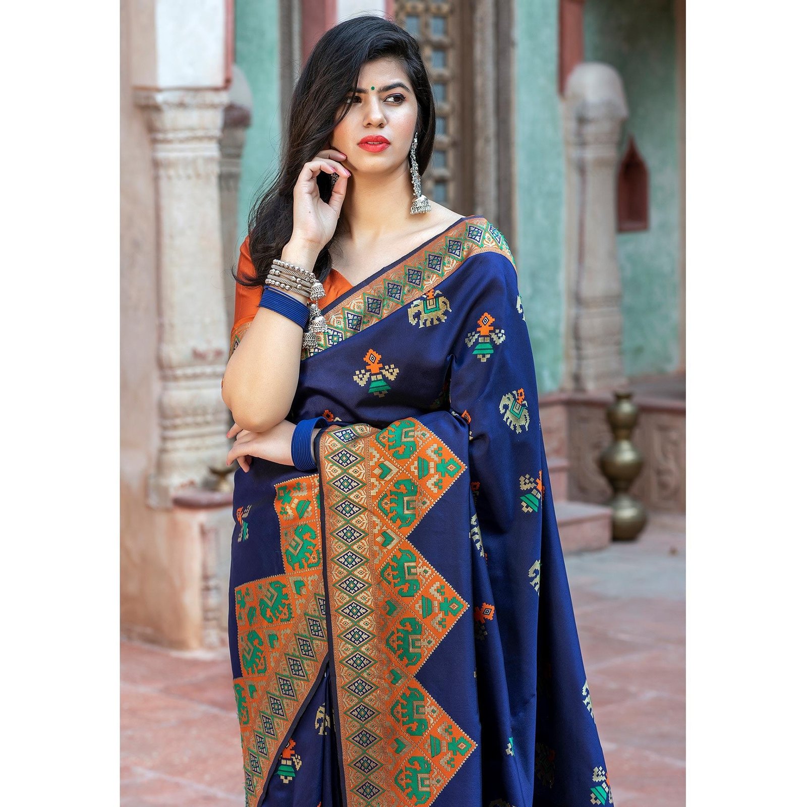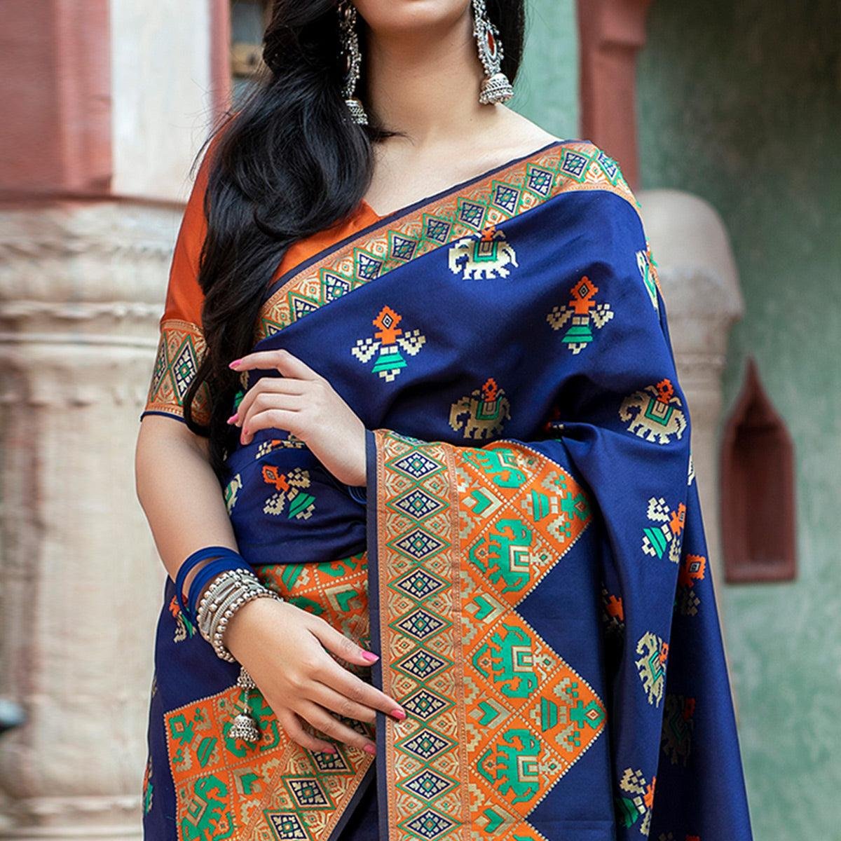 Be an angel and create and ascertain a smashing effect on anybody by carrying this navy blue colored saree. This saree is made from patola silk fabric which is highlighted with beautiful weaving work. This saree is paired with unstitched matching blouse piece which can be stitched as per your requirement. This saree is comfortable to wear and care. You can wear this saree for casual outings, office, regular social meets and other homely events. Pair it with stylish accessories to complete the look. Note:- The actual product may differ slightly in color and design from the one illustrated in the images when compared with computer or mobile screen.