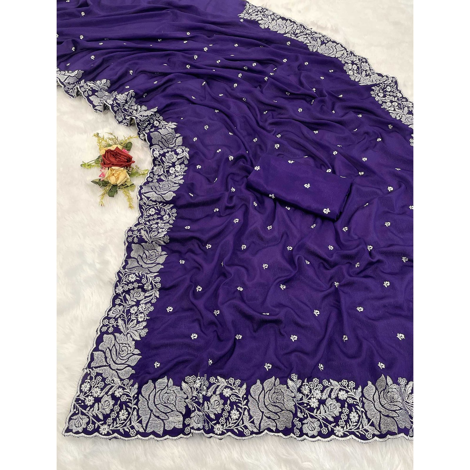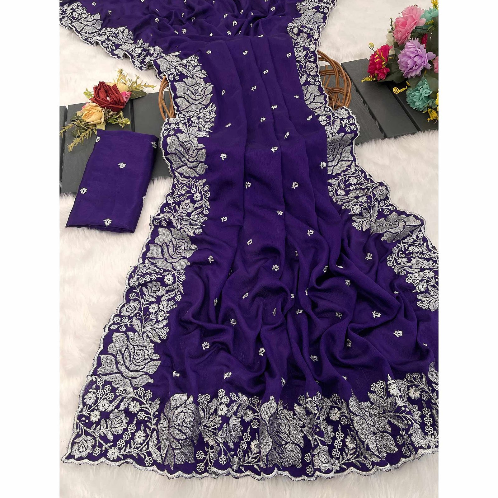 - Graceful Elegance: Make a lasting impression with this captivating royal purple color chinon chiffon saree, featuring butterfly floral silver zari embroidery work perfect for festive and special occasions.