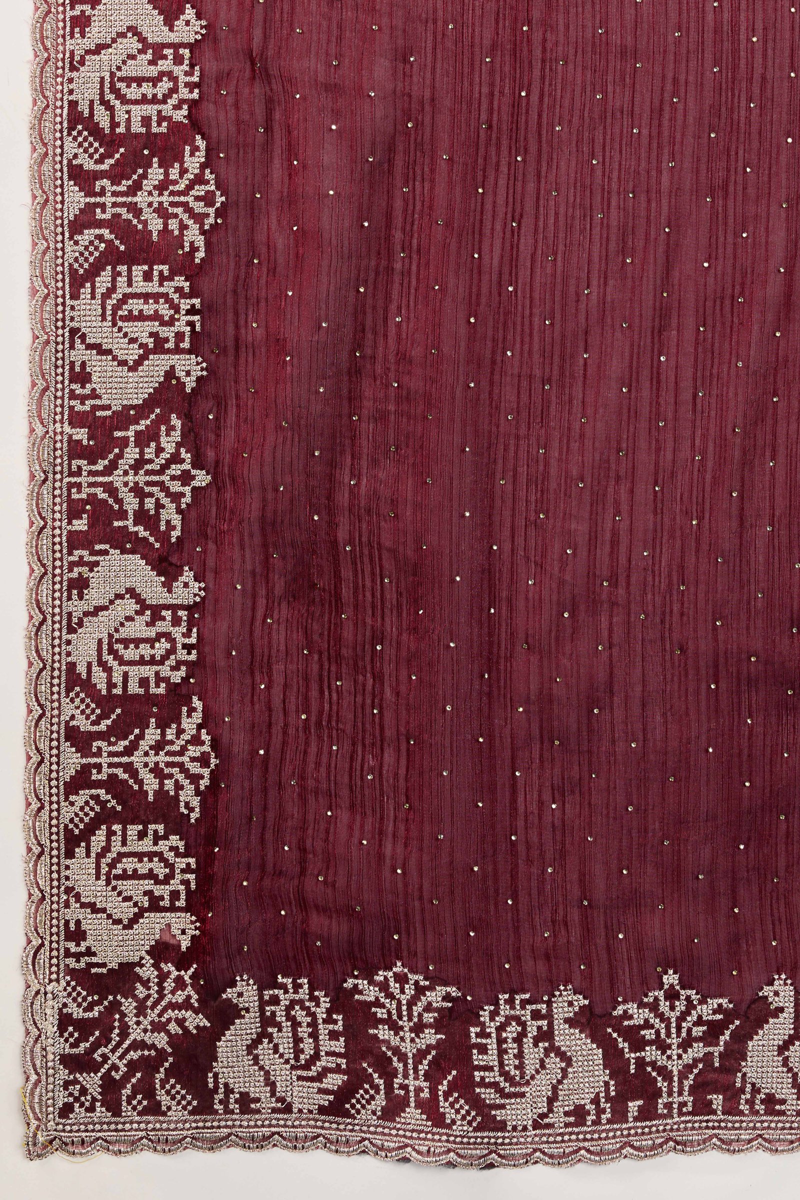 - Graceful Appeal: Maroon saree is crafted from a rich silk blend fabric and enhanced with exquisite embroidery and delicate stone work for a refined look.