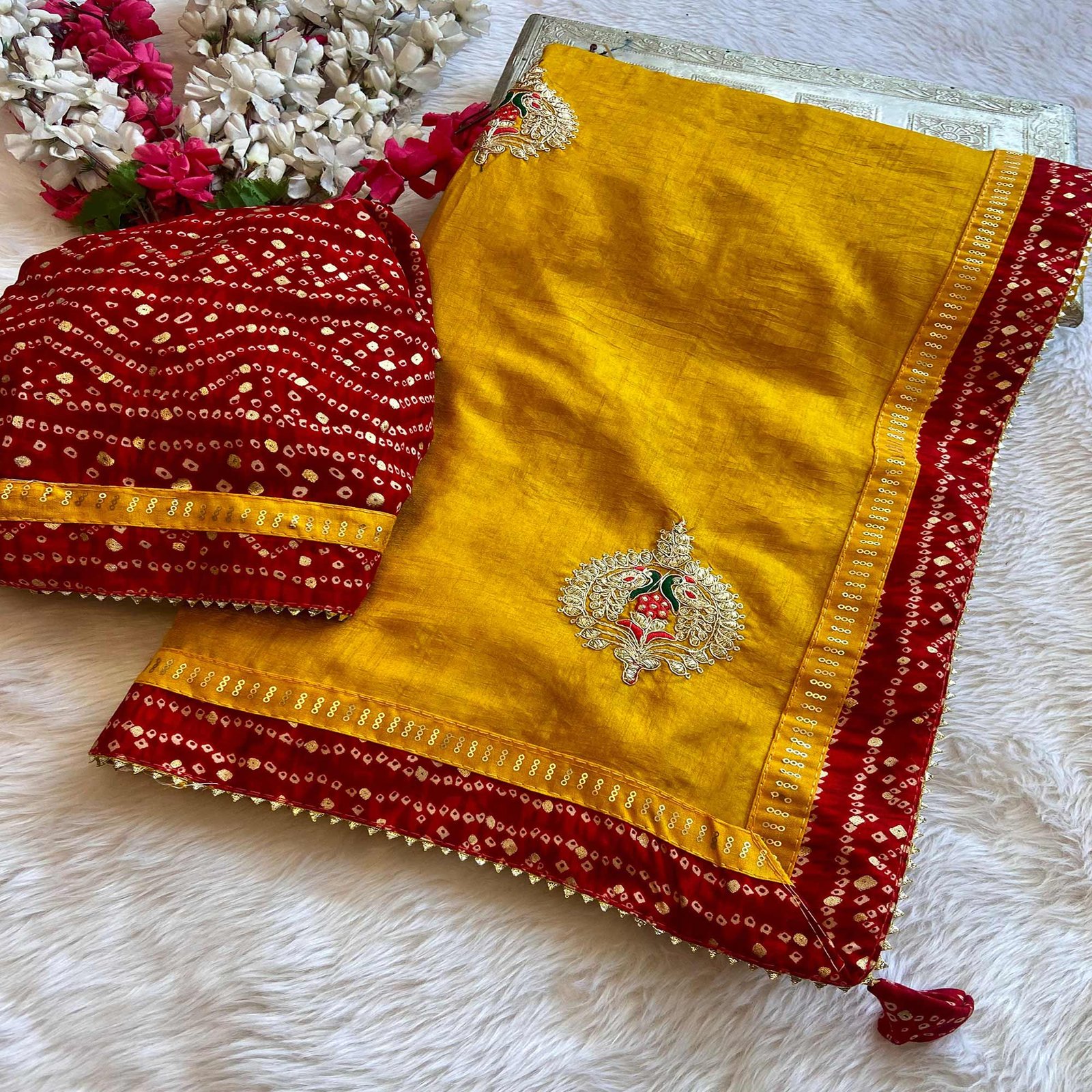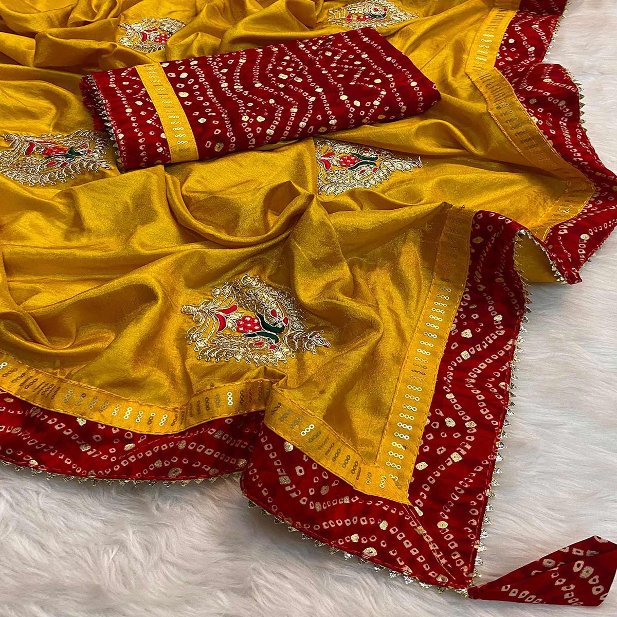 Mustard colored style saree is made from vichitra silk fabric which is highlighted zari embroidery as shown. comes along unstitched vichitra silk blouse piece which you can customize as per your design/style. Occasion – You can wear this saree for festive and functions.