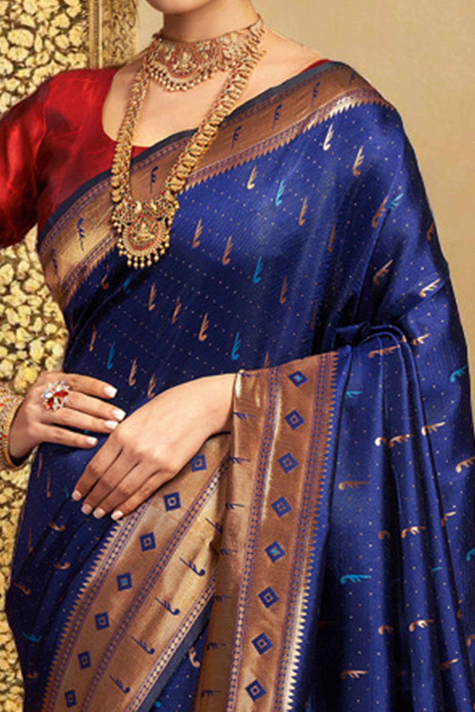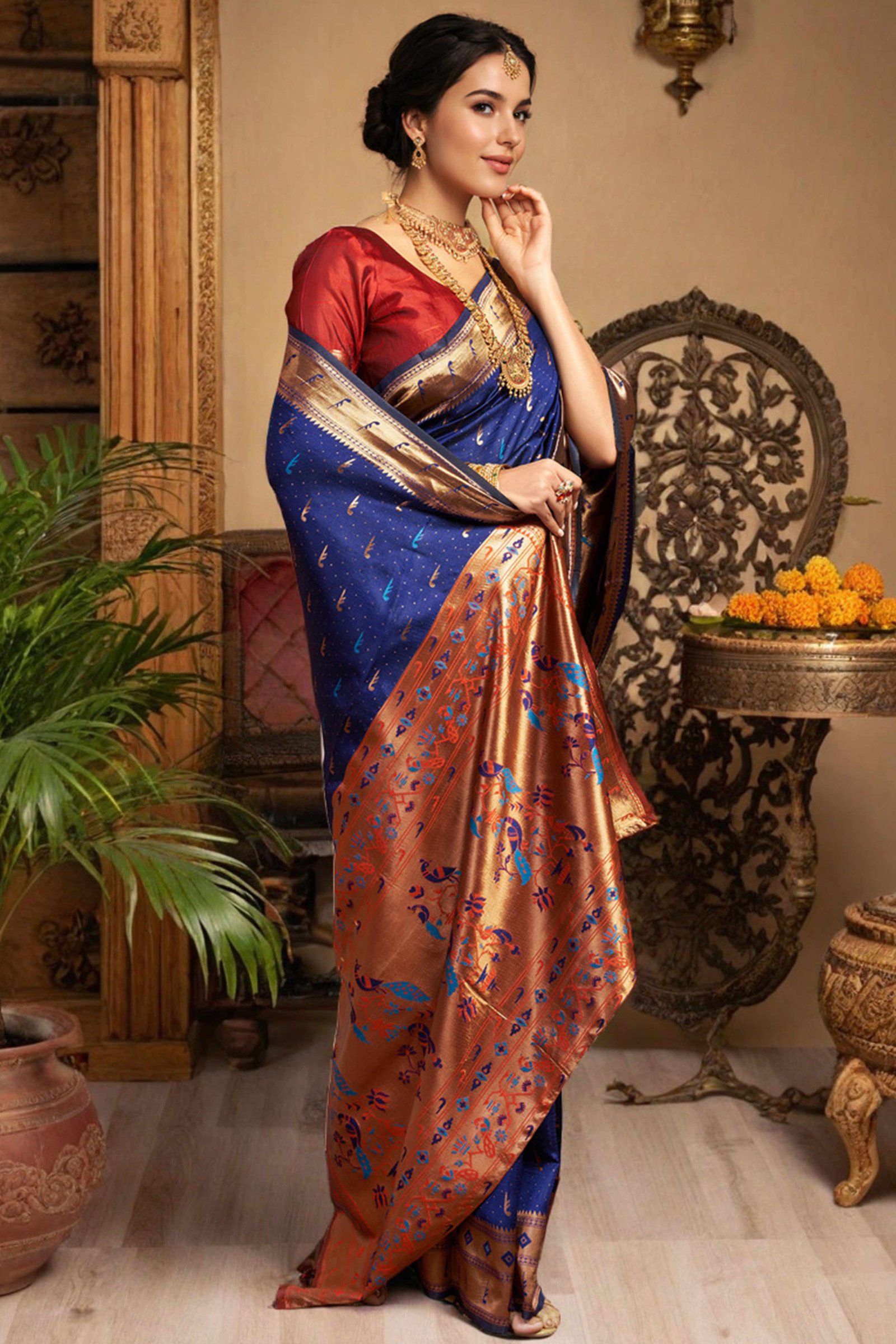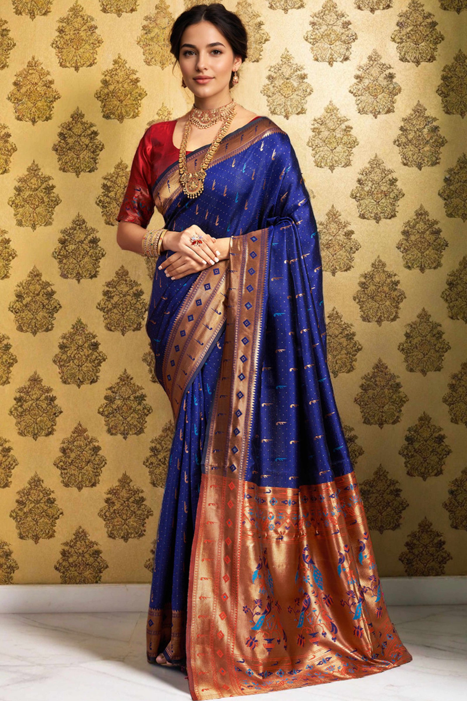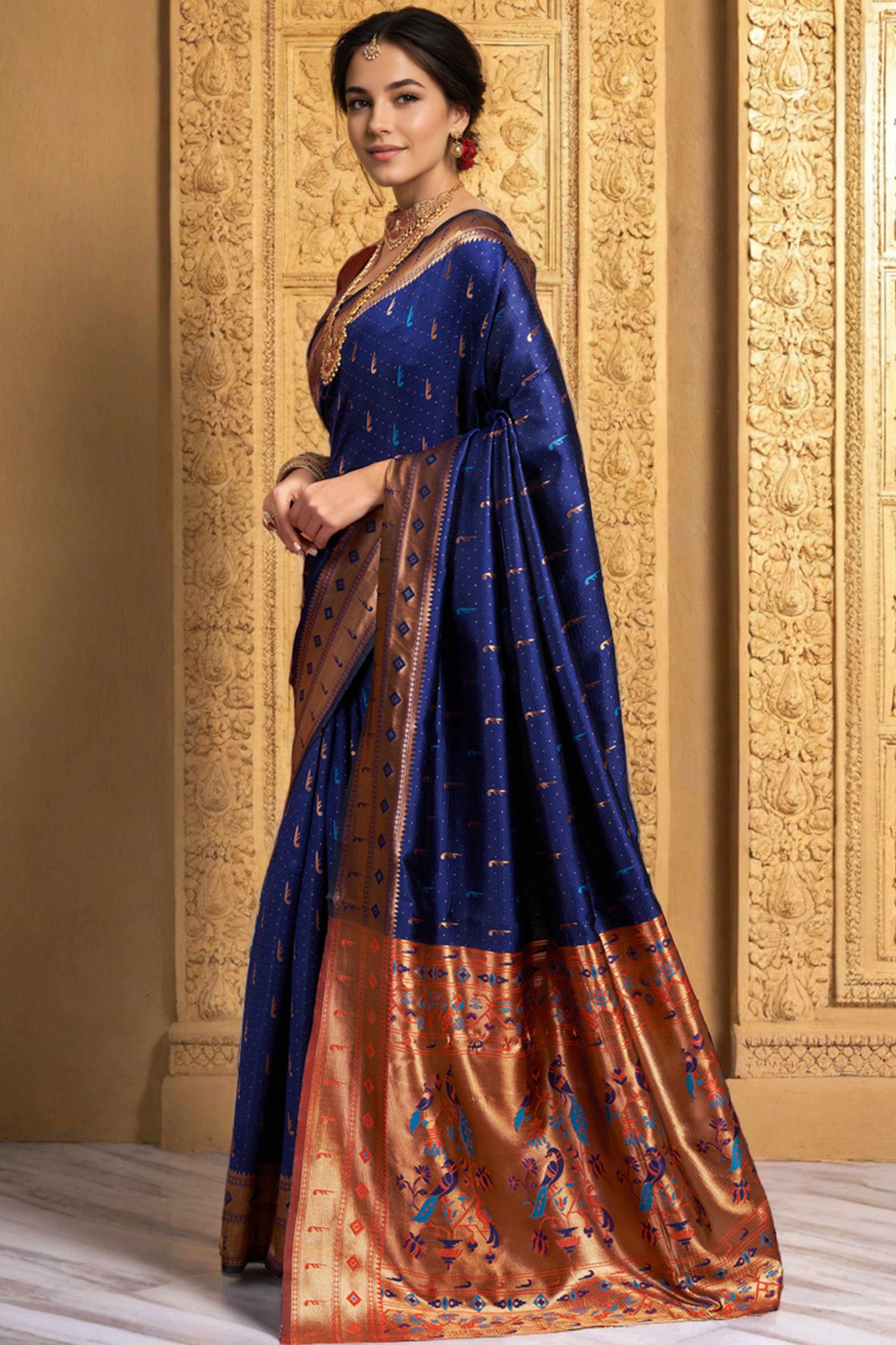 - Elegant Appeal: Infuse timeless elegance into your ethnic wardrobe with this stunning navy blue Paithani saree, adorned with intricate zari weaving and a gracefully detailed peacock motif pallu. A perfect blend of heritage and sophistication, it creates a striking impression at any special occasion.