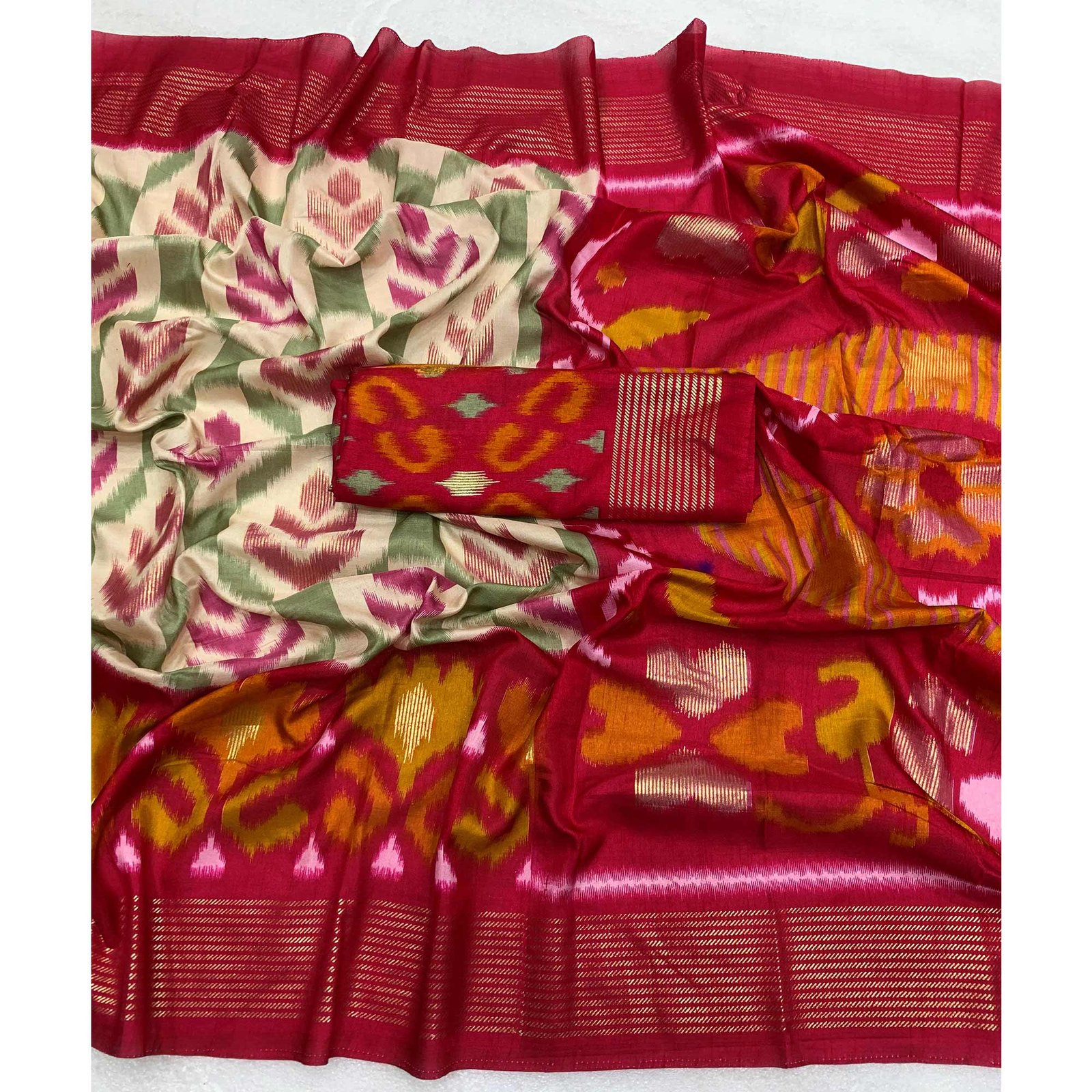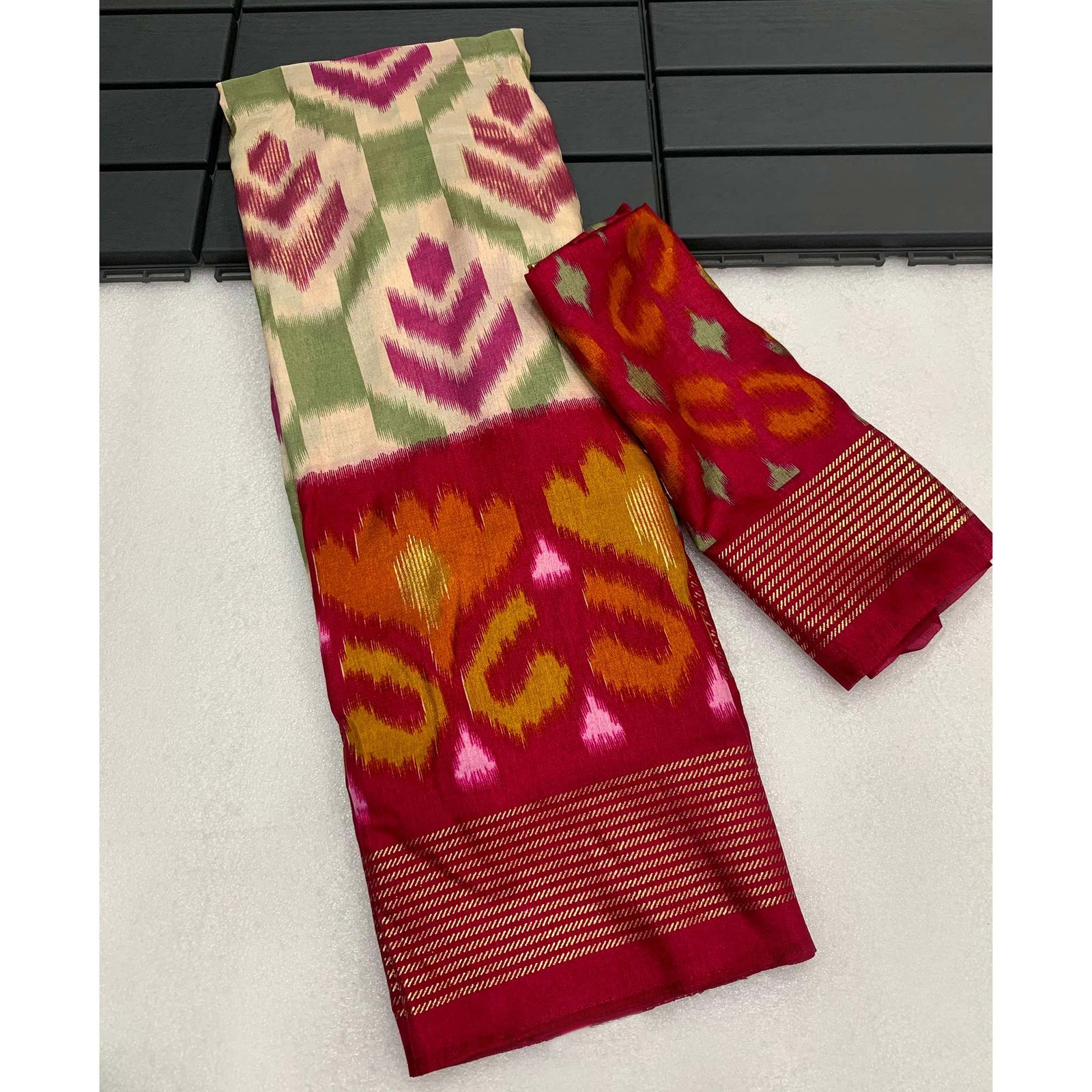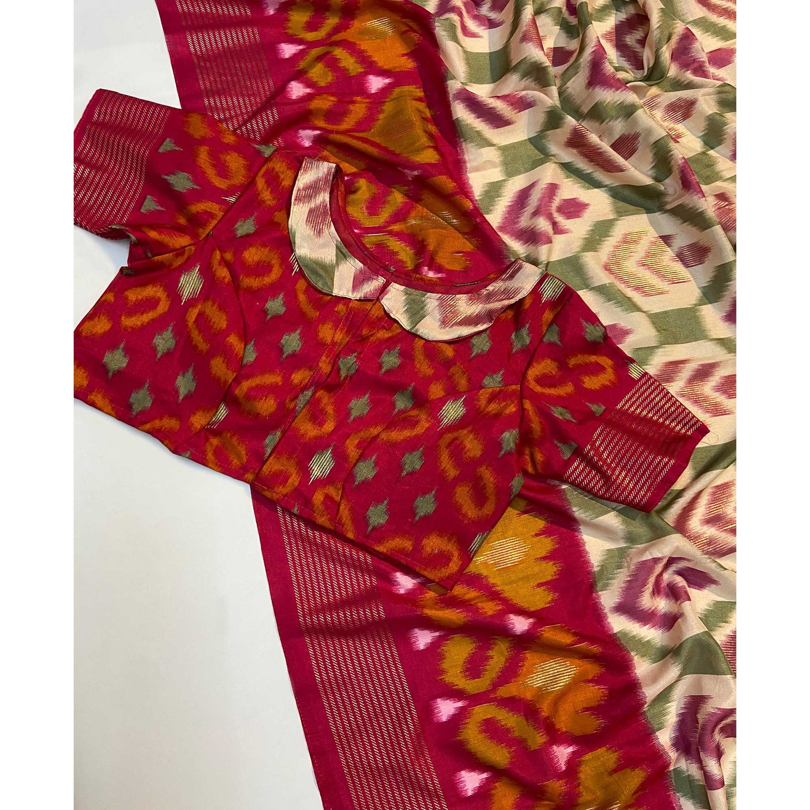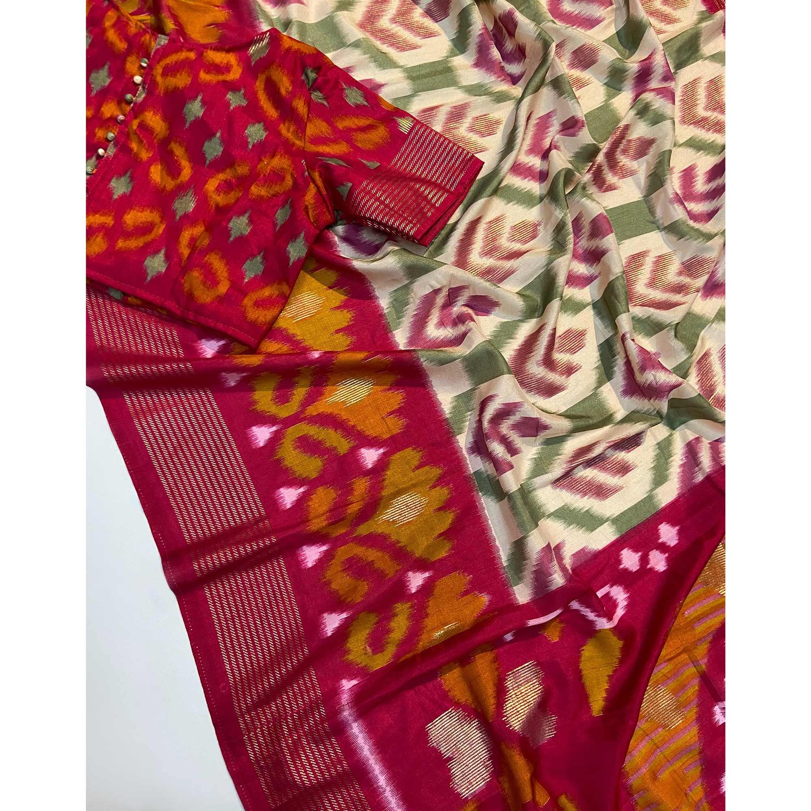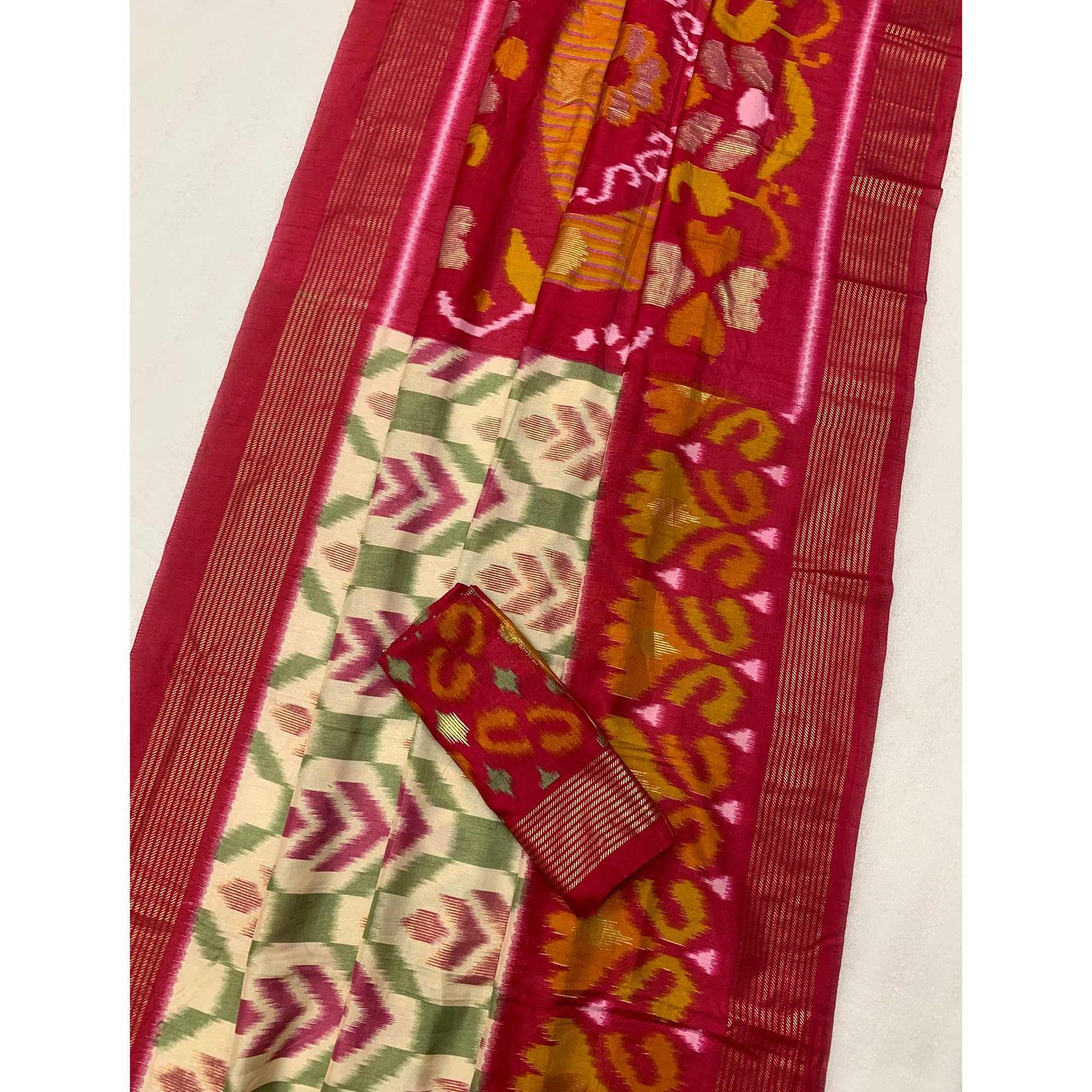 Off White & Pink colored saree is made from viscose fabric which is highlighted with beautiful patola printed work as shown. comes along unstitched viscose blouse piece which you can customise as per your design/style. Occasion – You can wear this saree for festive and functions.