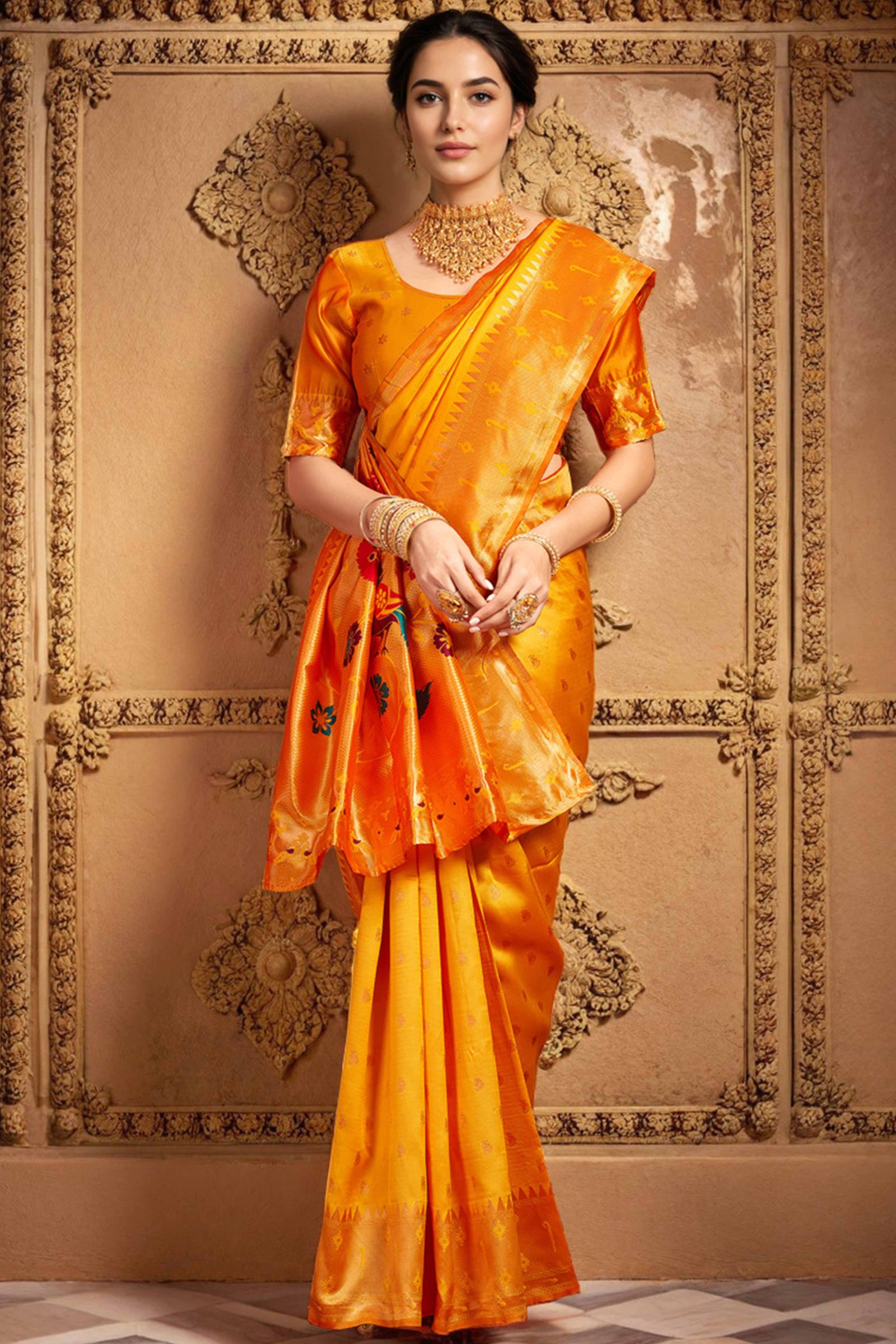 - Graceful Aesthetic: Redefine elegance with this timeless orange Paithani saree, beautifully detailed with intricate zari weaving and a majestic peacock and floral motif pallu. Designed to reflect cultural richness and sophistication, it’s a perfect pick for statement-making occasions.
