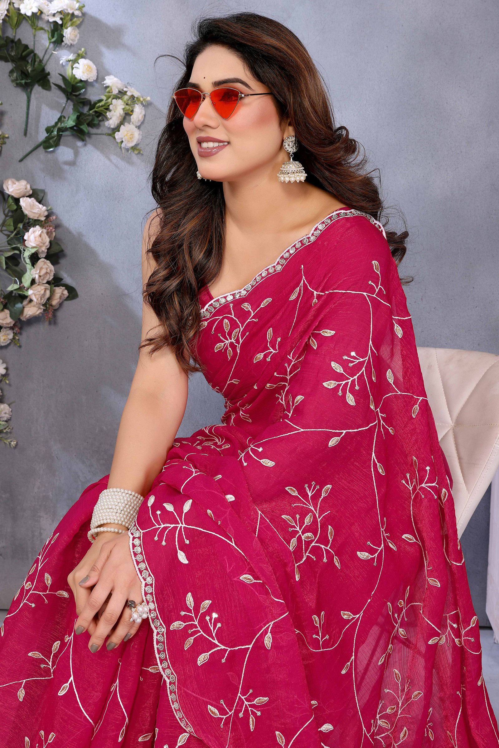 - Chic Elegance: Drape yourself in refined charm with this stunning pink color saree, adorned with delicate floral sequins embroidery and an artistic cutwork border for a look that’s both modern and timeless.