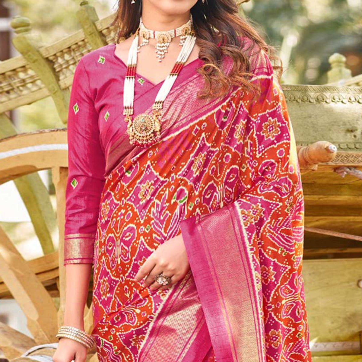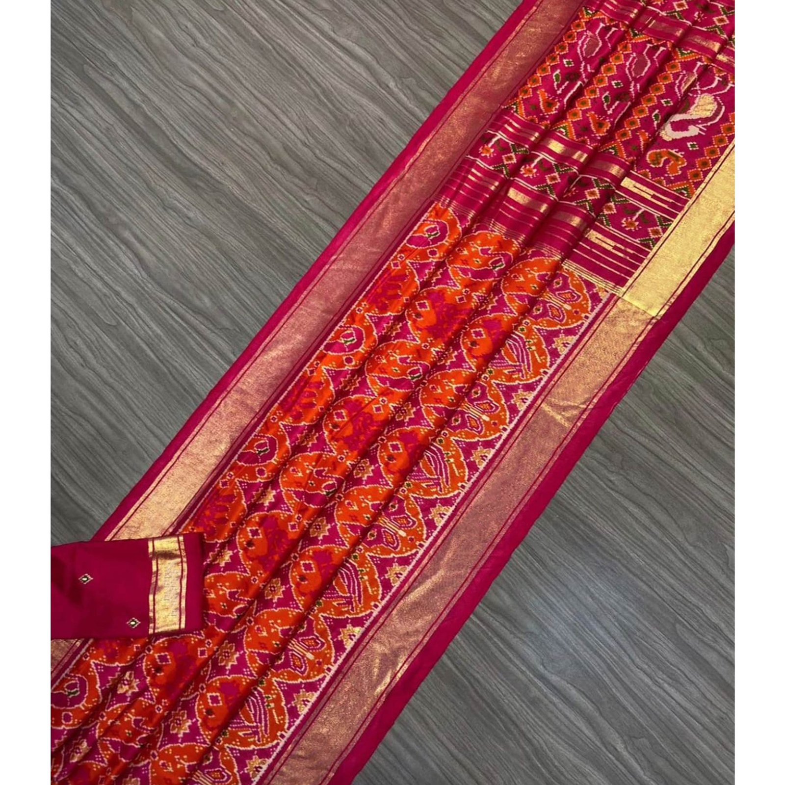 Pink & Orange colored saree is made from viscose fabric which is highlighted with beautiful patola printed work as shown. comes along unstitched viscose blouse piece which you can customise as per your design/style. Occasion – You can wear this saree for festive and functions.