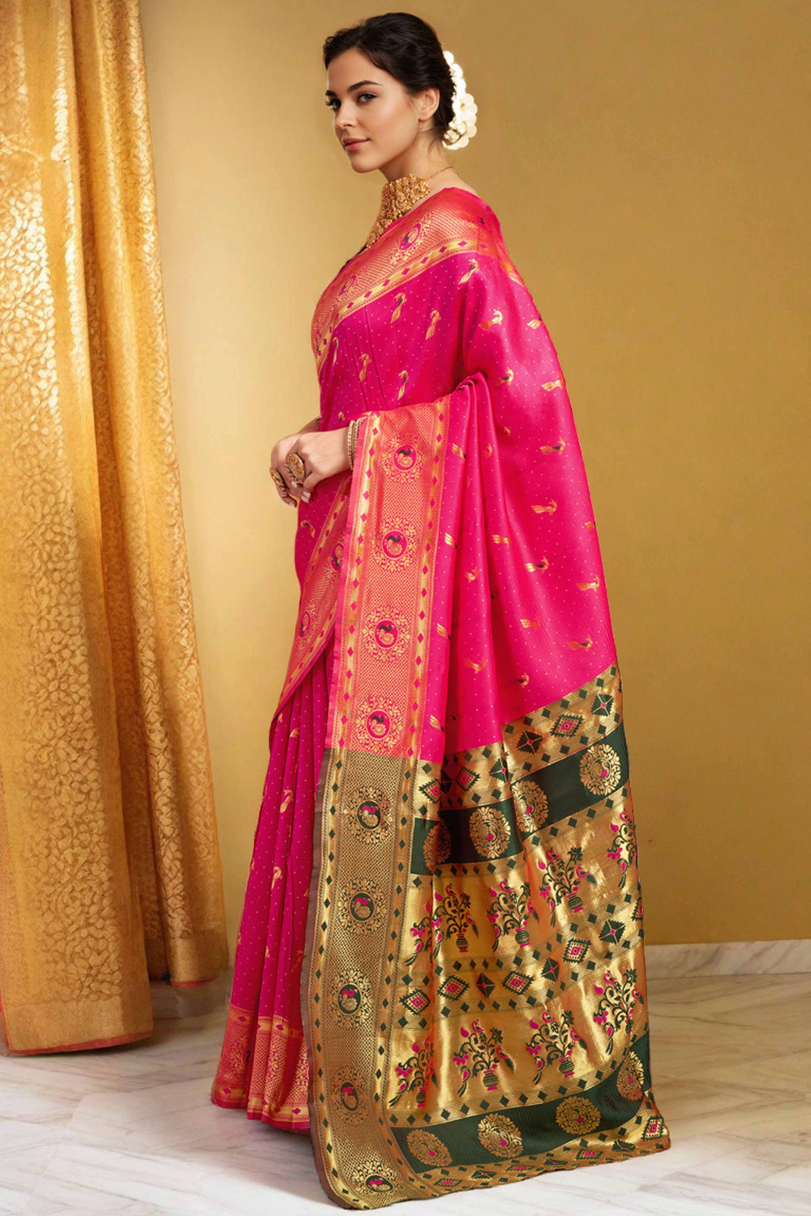 Pink Paithani Silk Blend Saree Featuring Intricate Zari Peacock & Floral Weaving