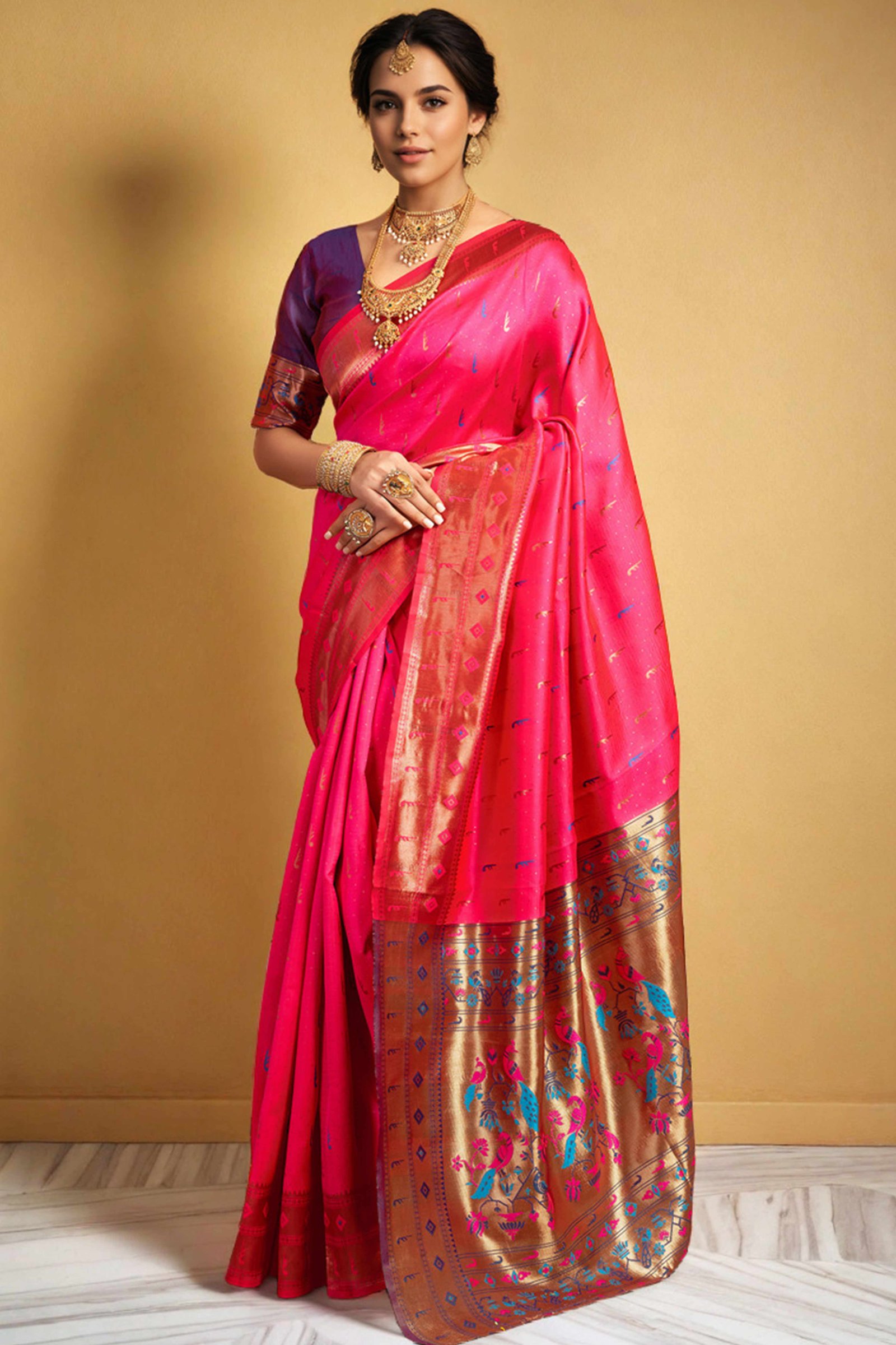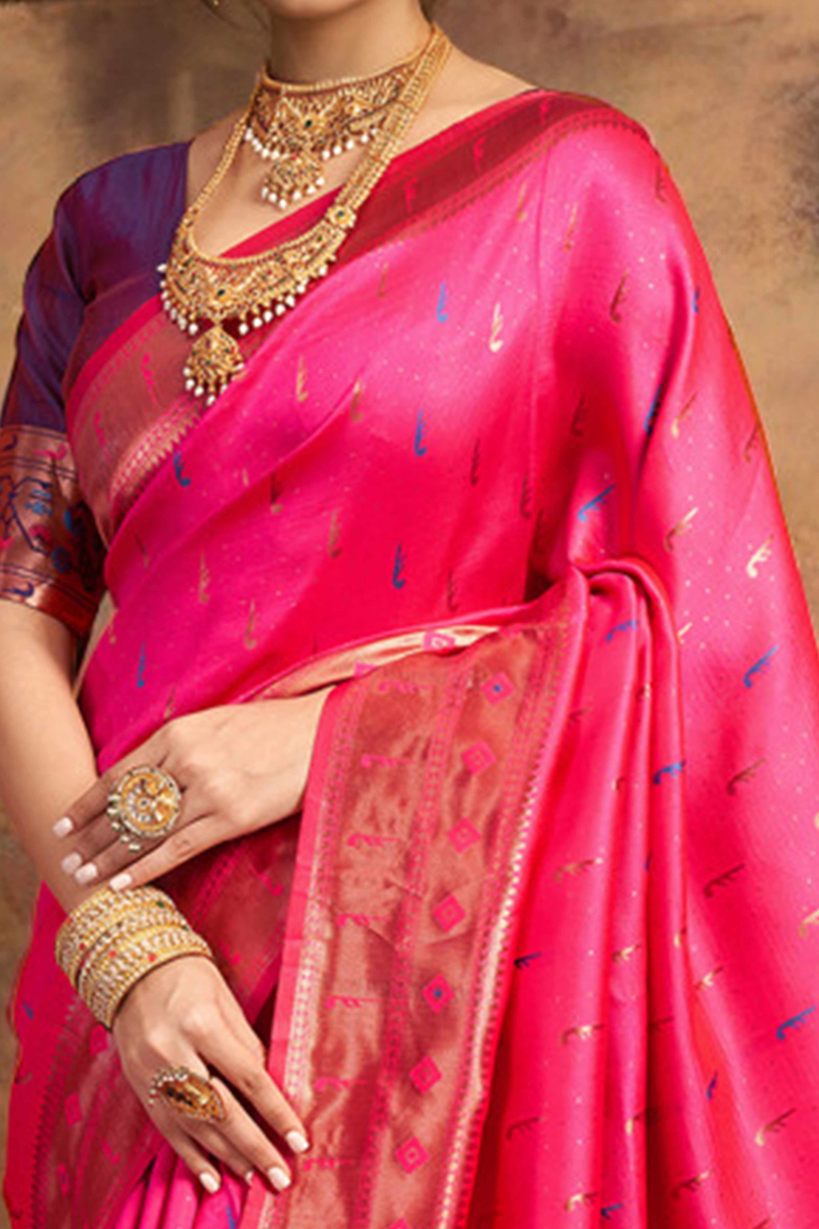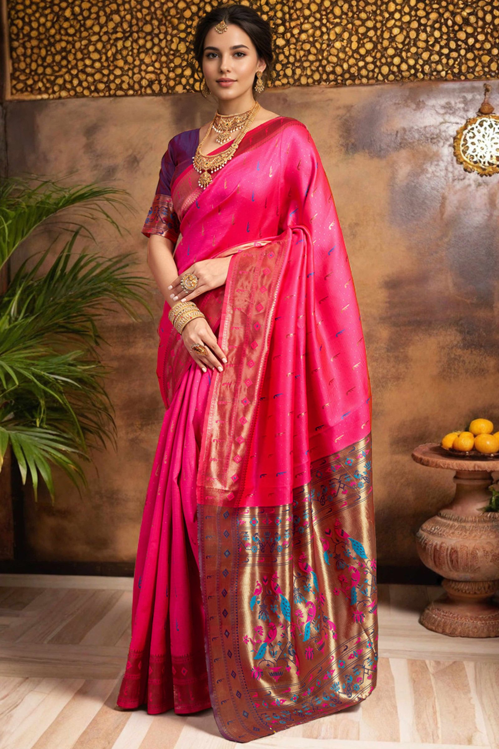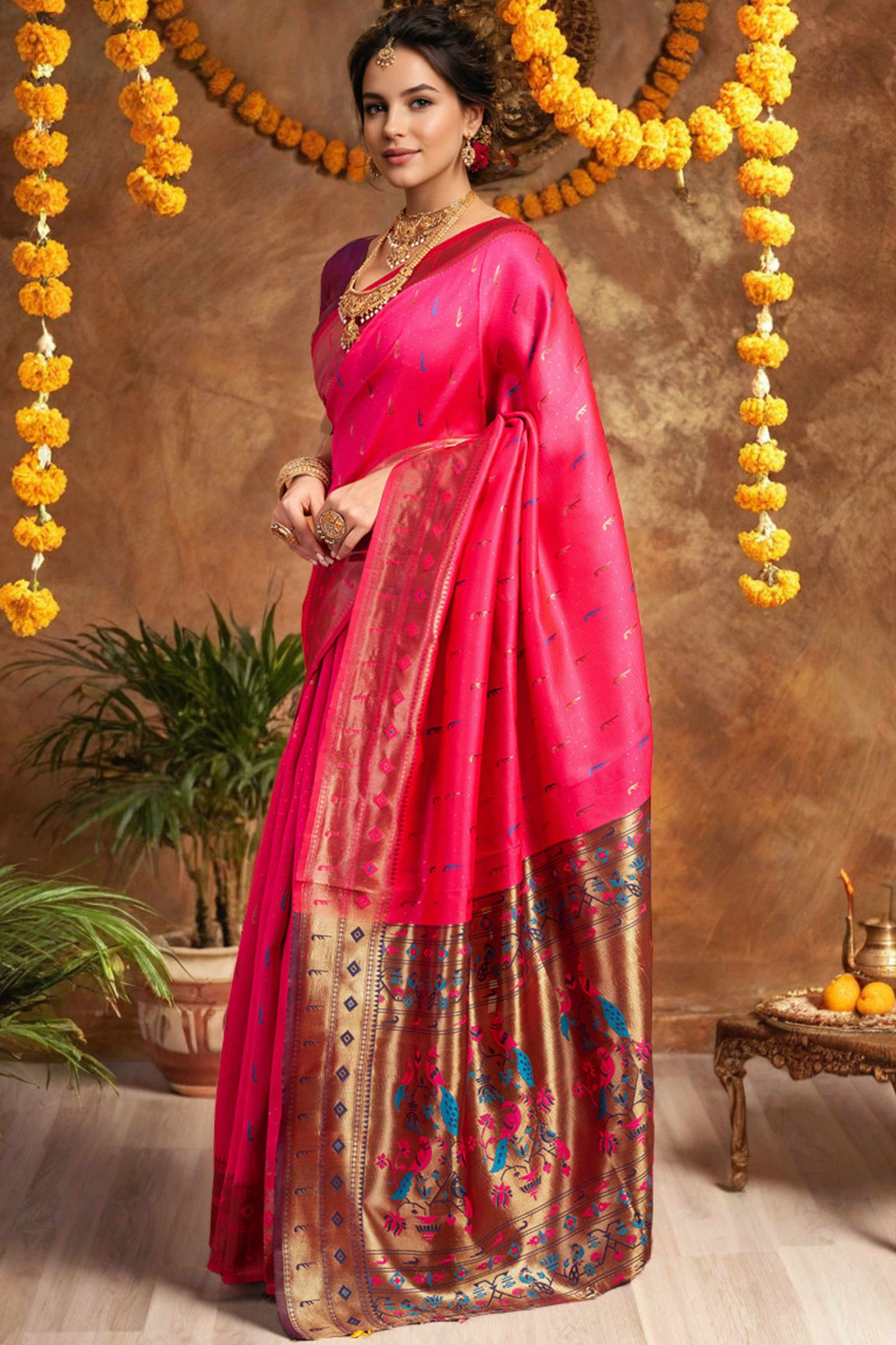 - Elegant Appeal: Infuse timeless elegance into your ethnic wardrobe with this stunning pink Paithani saree, adorned with intricate zari weaving and a gracefully detailed peacock motif pallu. A perfect blend of heritage and sophistication, it creates a striking impression at any special occasion.