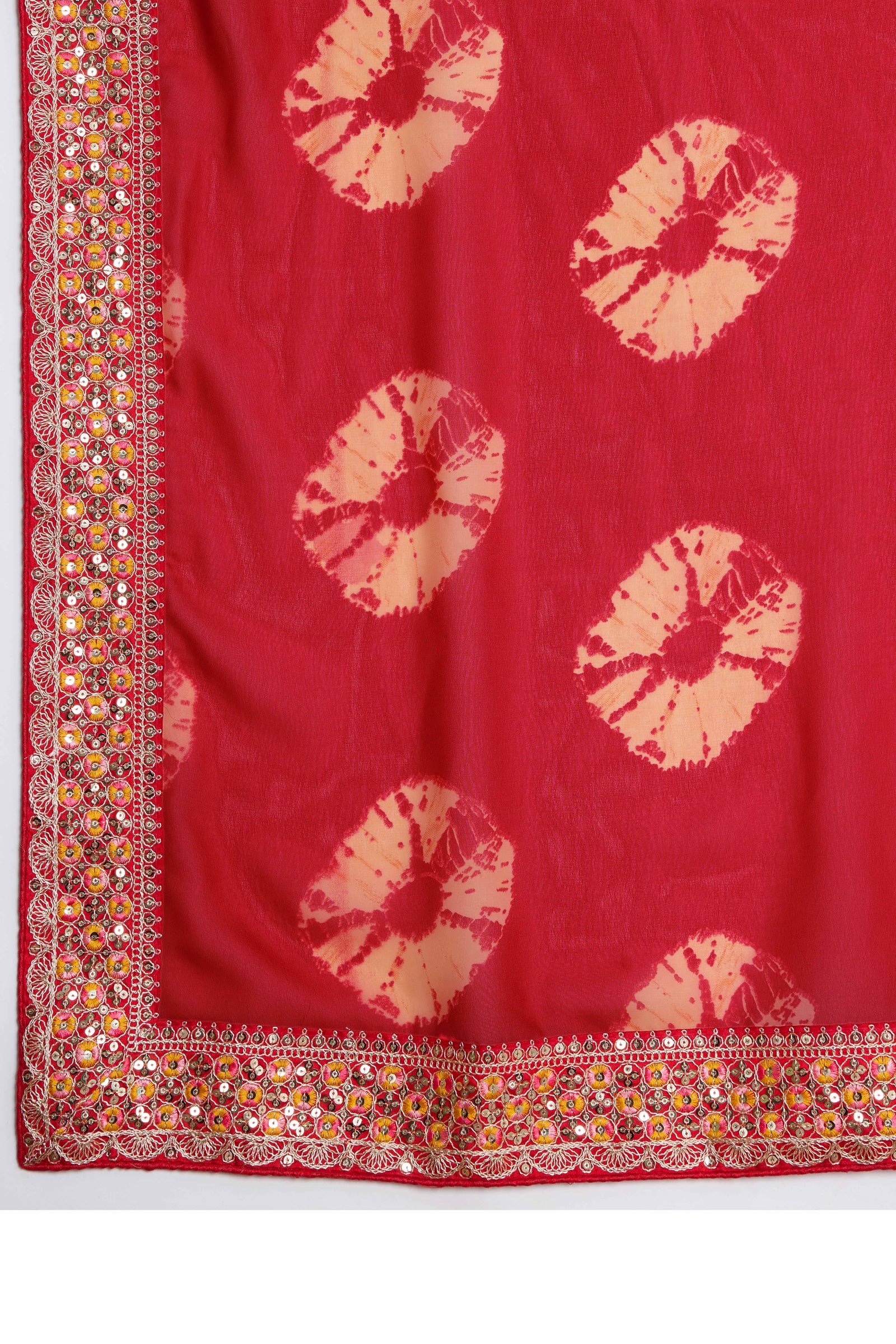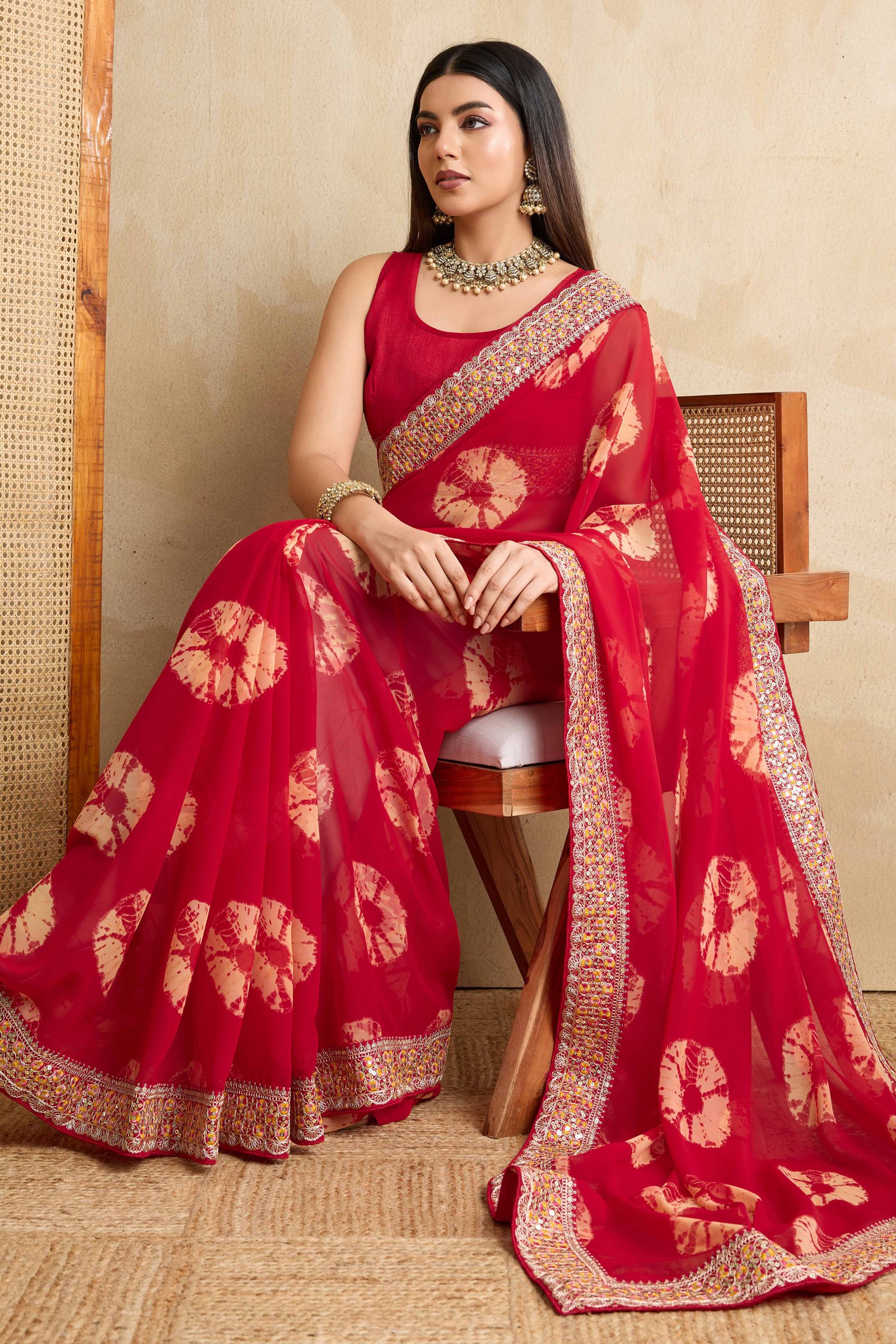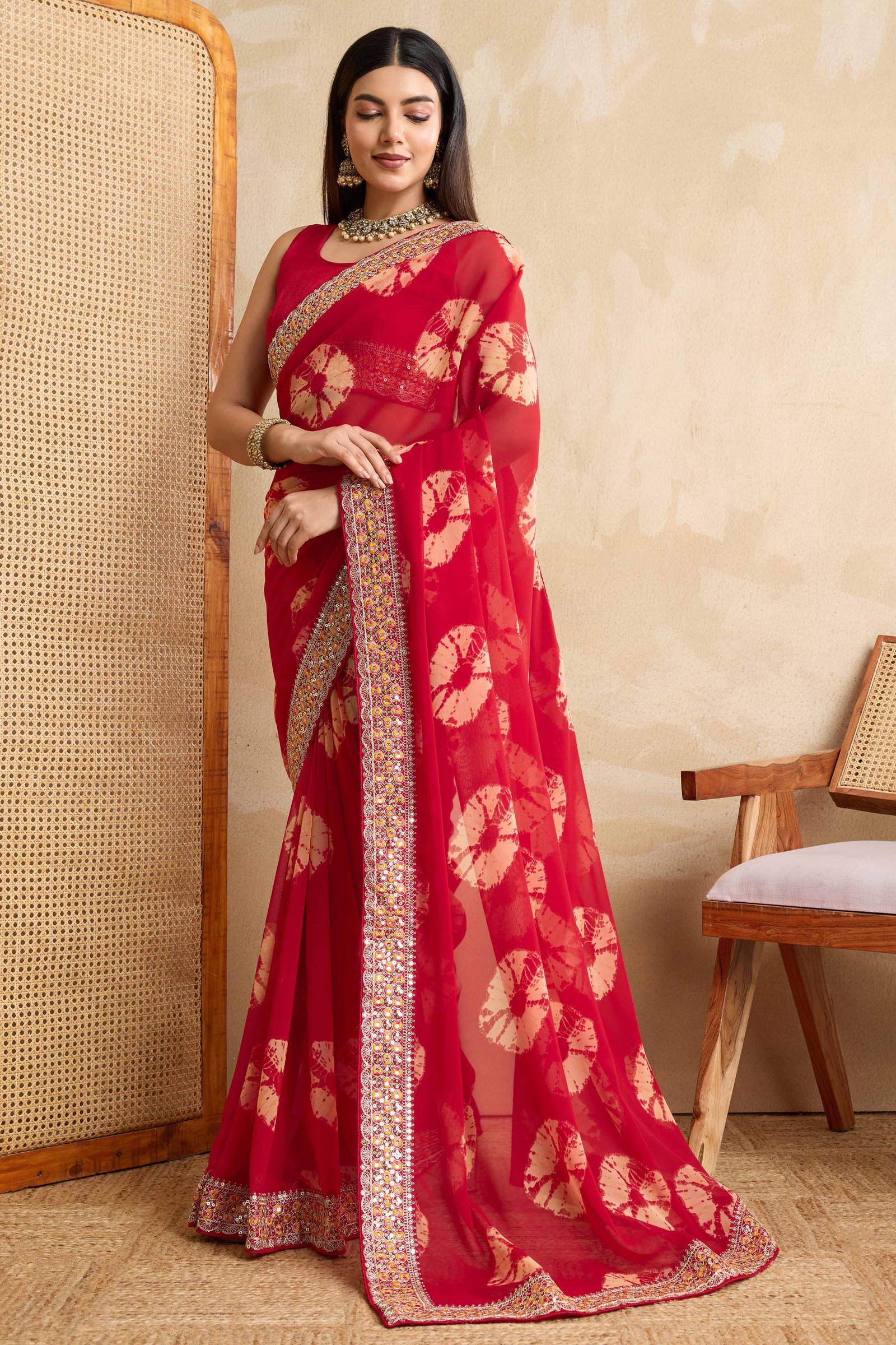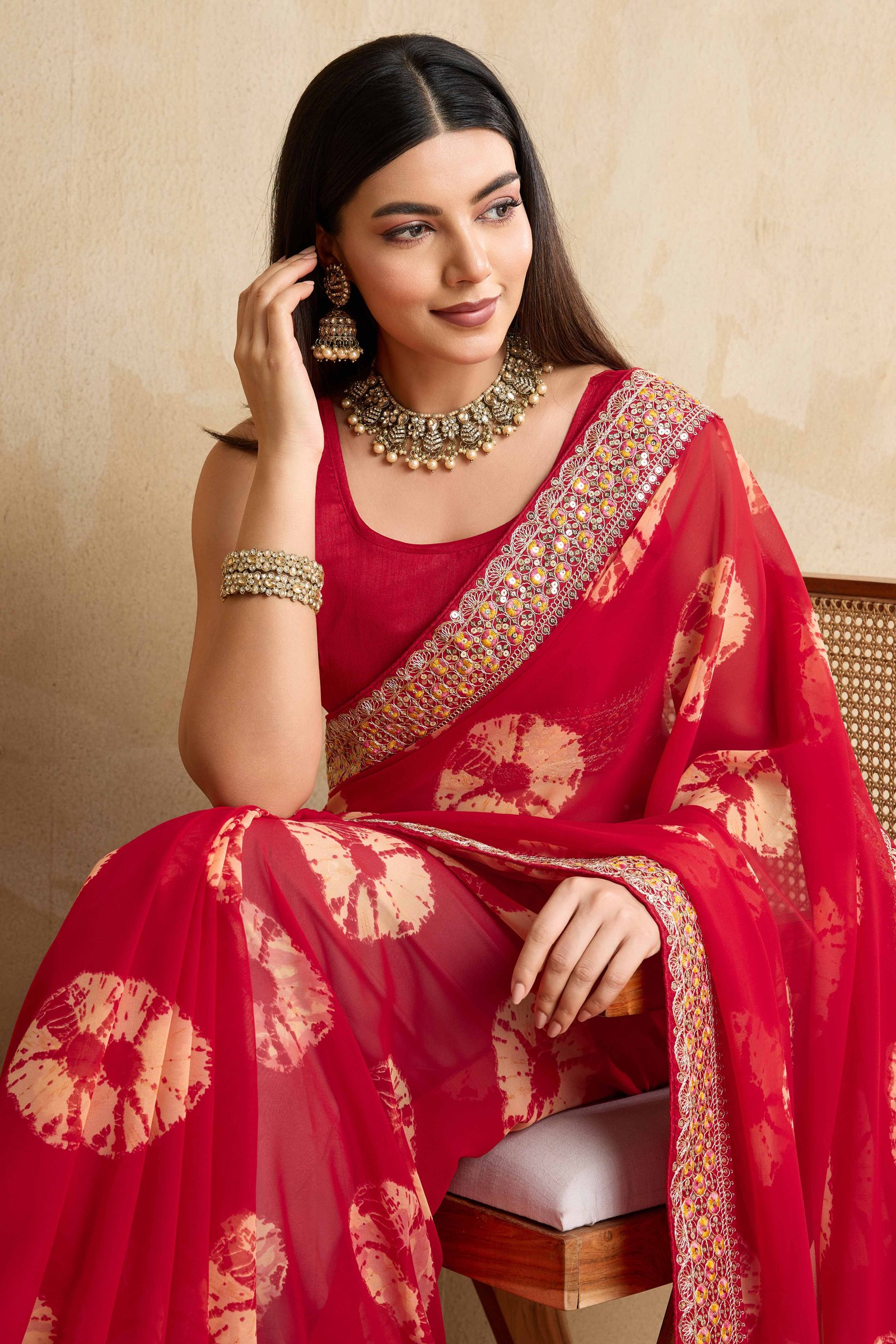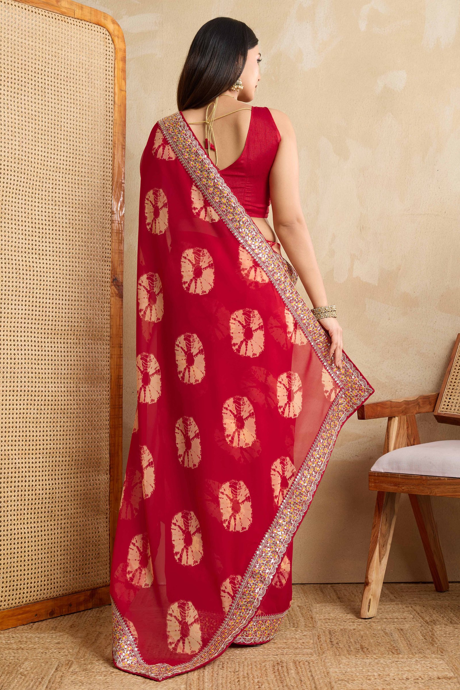 - Charming Elegance: Red colored saree adorned with a beautiful tie-dye print and lace work border, showcasing a vibrant and festive style as shown.