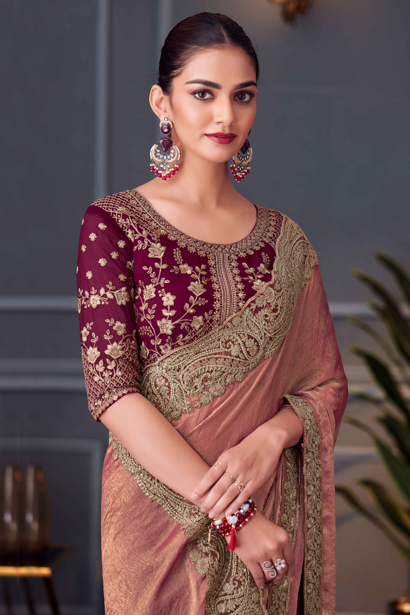 - Sophisticated Appeal: Rust colored style saree adorned with heavy sequins embroidery on the border, showcasing a festive and glamorous style as shown.