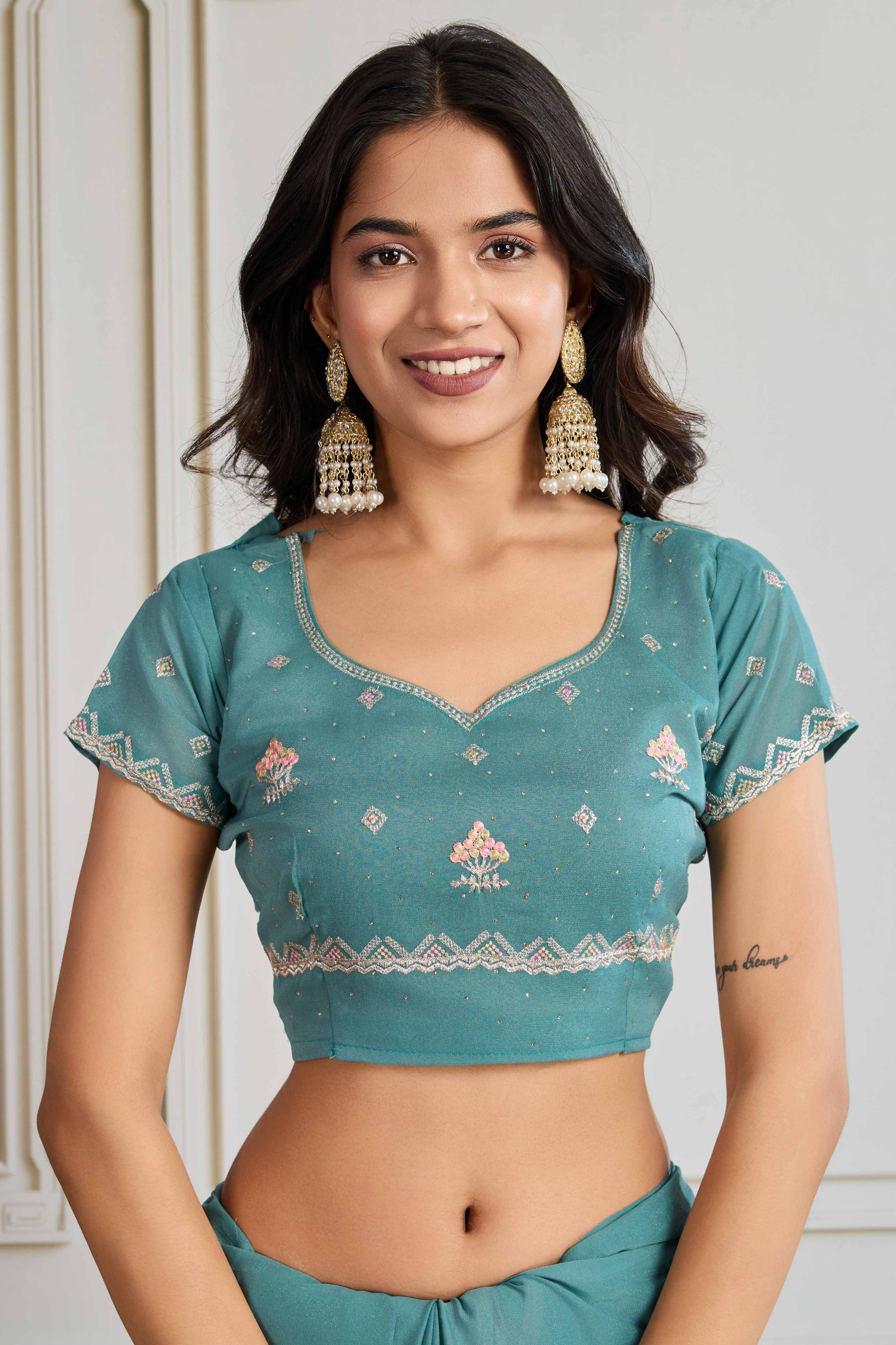 - Elegant Design: Teal saree is crafted from lightweight georgette fabric and adorned with intricate embroidery and stone work for a refined, eye-catching appeal.