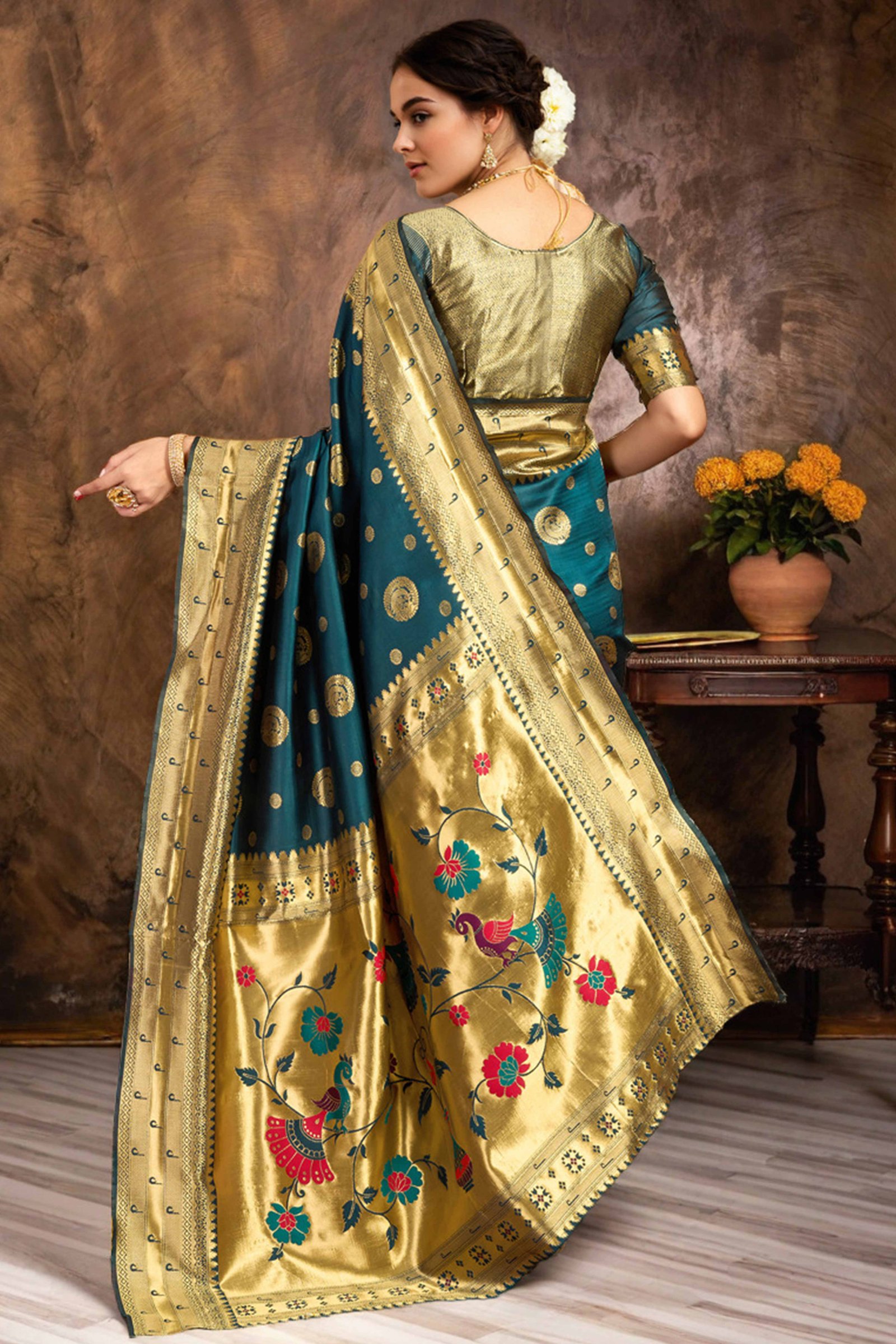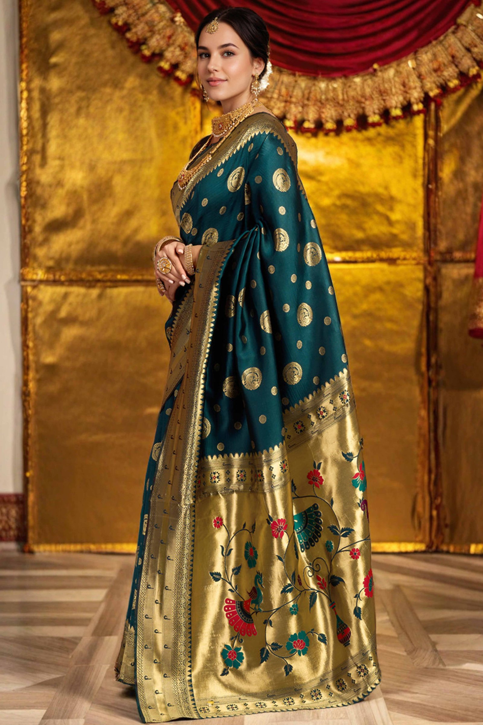 - Traditional Elegance: Make a graceful statement with this stunning teal Paithani saree, adorned with intricate zari weaving and a signature peacock and floral motif pallu. A blend of cultural richness and artistic finesse, this saree is perfect for showcasing timeless style.