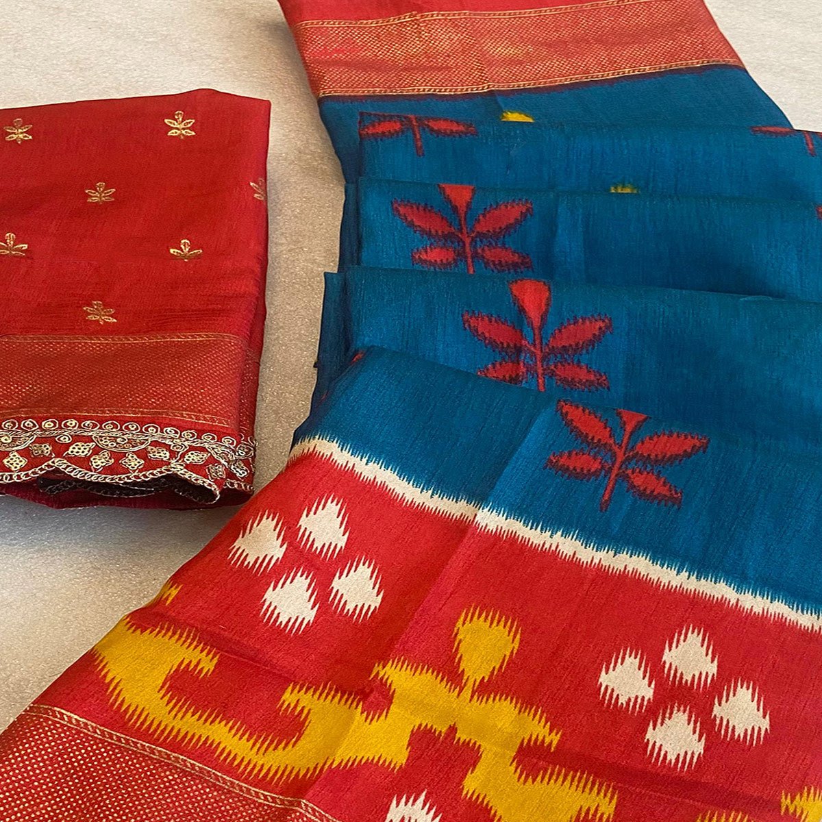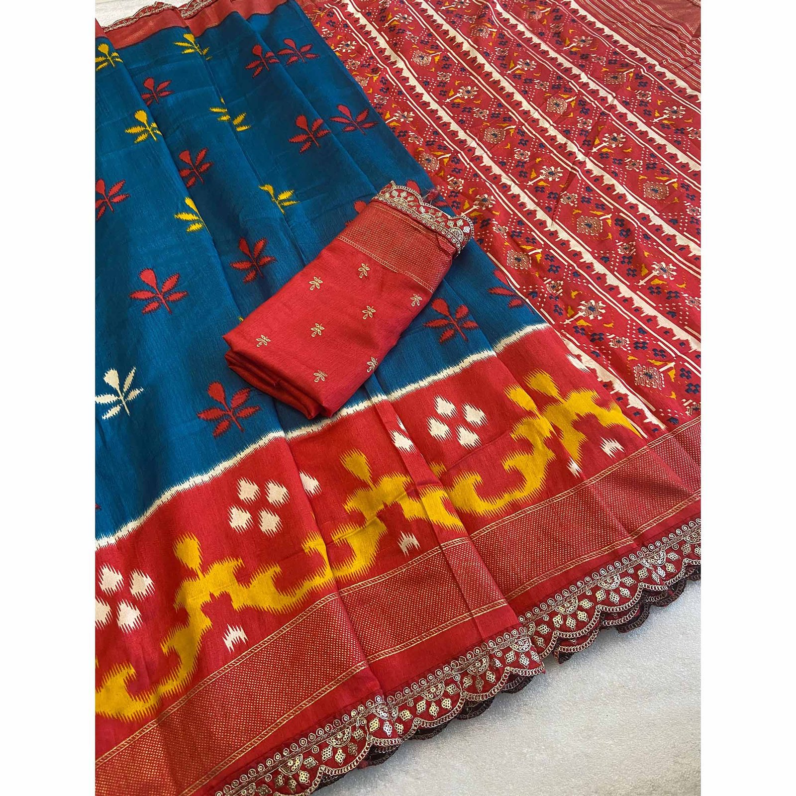 Teal colored saree is made from dola silk fabric which is highlighted with beautiful patola printed work with sequins border work as shown. Comes along with unstitched printed dola silk blouse piece which you can customize as per your design/style. Occasion – You can wear this saree for festive and functions. Note:- the actual product may differ slightly in color and design from the one illustrated in the images when compared with computer or mobile screen.