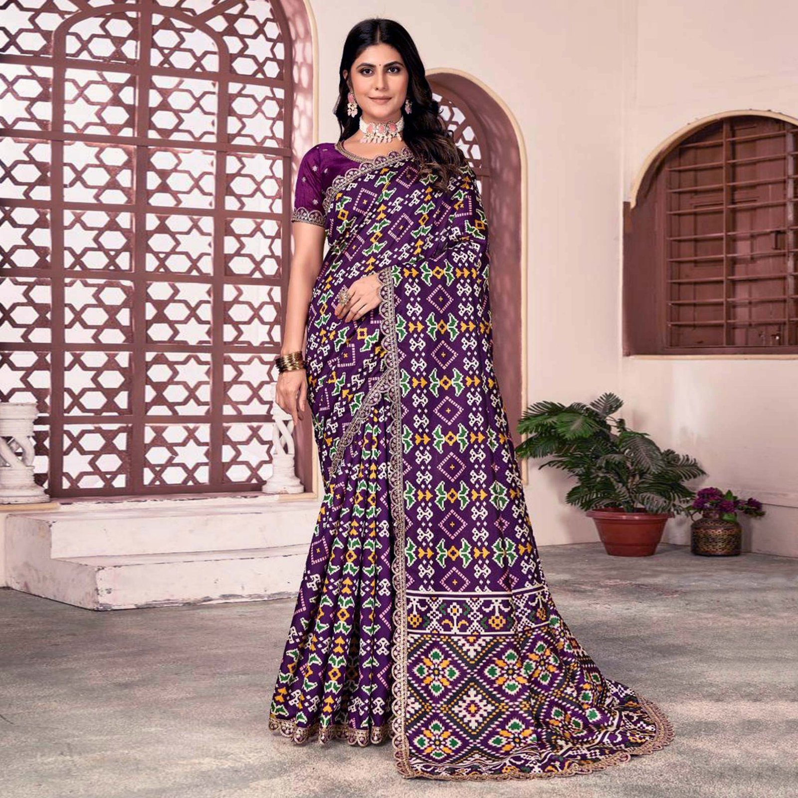 Wine colored saree is made from tussar silk fabric which is highlighted with patola print as shown. Comes along with unstitched tussar silk blouse piece which you can customize as per your design/style. Occasion – You can wear this saree for festive and functions.