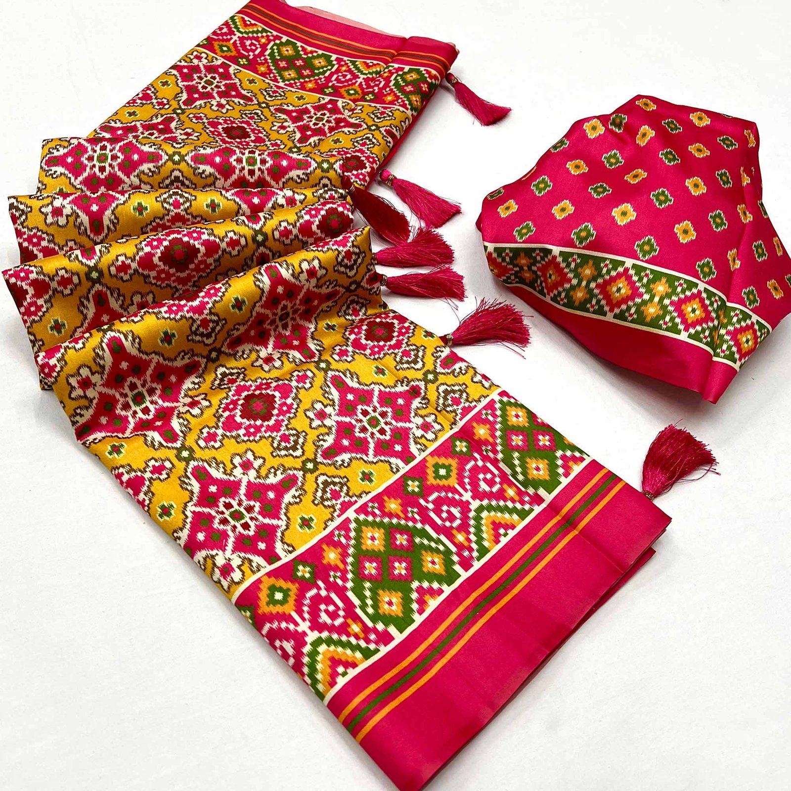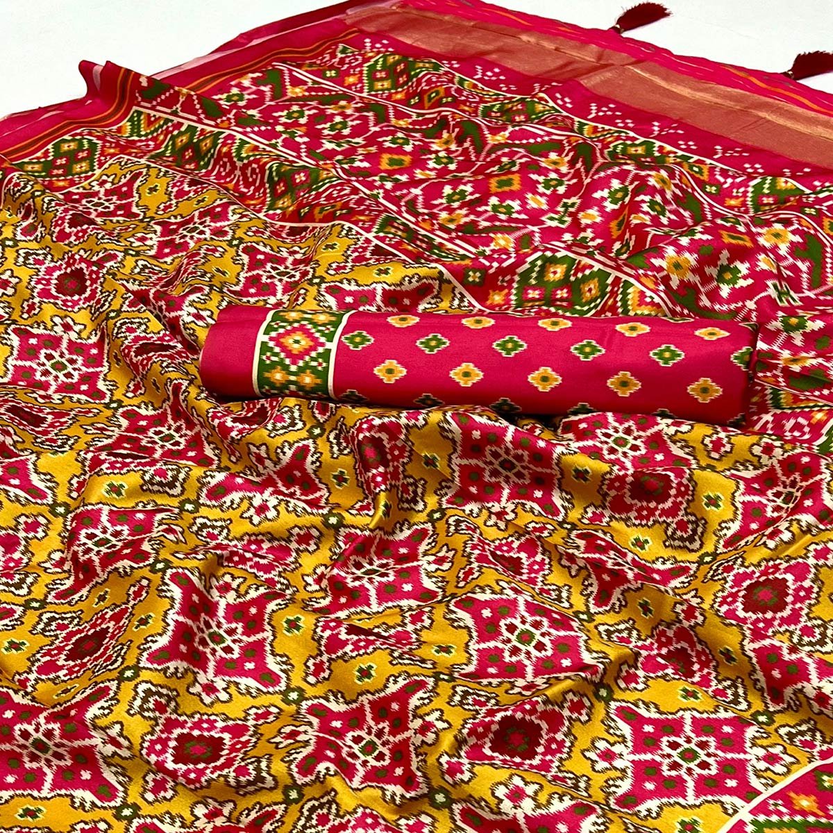 Yellow & Pink Patola Printed Tussar Silk Saree With Tassels